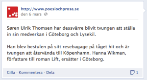 Borde ha åkt upp till systerdottern i Lysekil förra veckan. Läser för sent i biblioteksprogrammet deras att Søren Ulrik Thomsen (poet) och Ellen Mattson (romanförfattarinna) var inbokade. Ja, Mattson har jag inte läst, men Thomsen är en gammal favoritpoet. Har lyssnat till honom många gånger både i Sverige og Danmark. I fjol på Lunds stadsbibliotek, fast det var en ganska blek uppläsning. Dessförinnan såg jag honom på Inkonst i Malmö – där jag minns att även Pia Tafdrup och Håkan Sandell läste. Och Stickan Larsson från Lilla Essingen. Det var en laddad afton där alla var i god form.