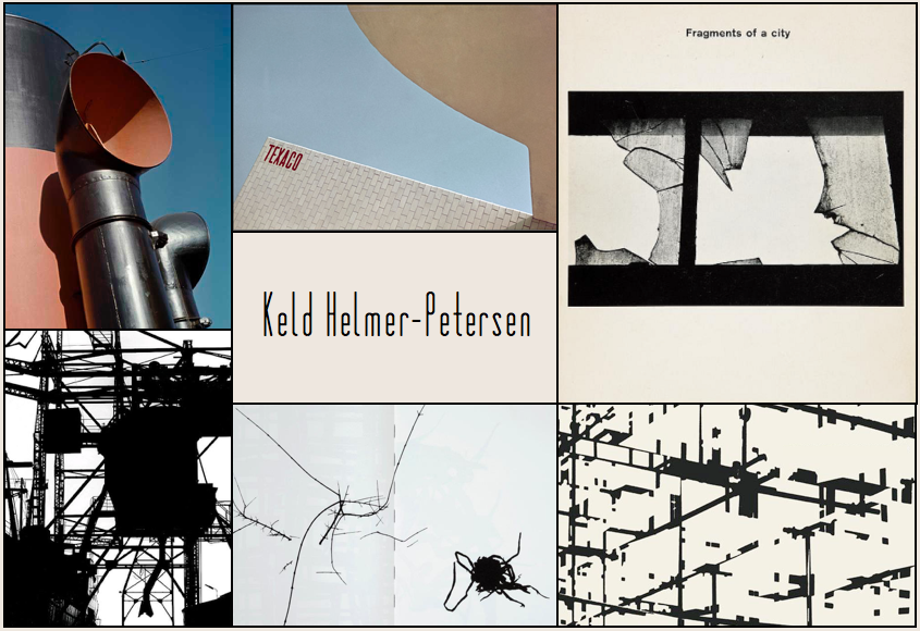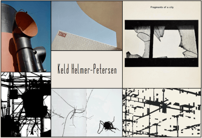 Keld Helmer-Petersen fick sin första kamera, en Leica, i studentpresent som 19-åring. Året var 1939 och han cyklade runt i Köpenhamn och fotograferade så det stod härliga till. Man ser i samlingarna hur han som ung och oskolad stannar upp inför vardagsmotiven, söker detaljer, linjer och abstraktion, skissar och letar efter sitt formspråk. Kompositionsmedvetenheten känns naturlig och intuitiv. Det rör sig en hel del om utkast och förstudier, långt ifrån allt är jättebra, men det är inte svårt att identifiera talang och känna av ett stort engagemang. Petersen kom att studera fotografi i Chicago, arbetade sedan som arkitekturfotograf i Danmark och undervisade på Kunstakademiets Arkitektskole. Första gången jag fick korn på hans fotokonst var under 80-talet på ett antikvariat i Köpenhamn; i Fragments Of A City (1960) – fotografier från Chicago med stadsattribut och skylines i siluett och svartvitt. Jag gillade den mycket, och minnet av konstfärdighet och konsekvens har stannat kvar. Vid en retrospektiv utställning i London 2006 berättade den då 86-årige dansken om sviten: