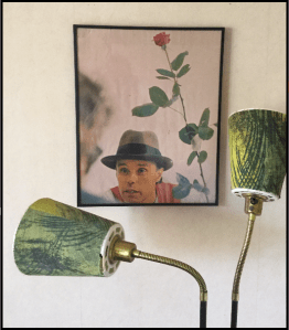 Jag har haft tyske konstnären Joseph Beuys hängande på diverse väggar sedan tidigt 90-tal. Men han har blivit mindre. Det här var en gång en stor affisch, som började gå sönder i kanterna och därför behövde beskäras. Efter varje flytt fick den nya revor och slutligen behövde det lilla som var kvar skyddas mot ytterligare förfall – så jag ramade in den. Det handlade om att rädda röda rosen kvar i bild! Det gör det alltid.
