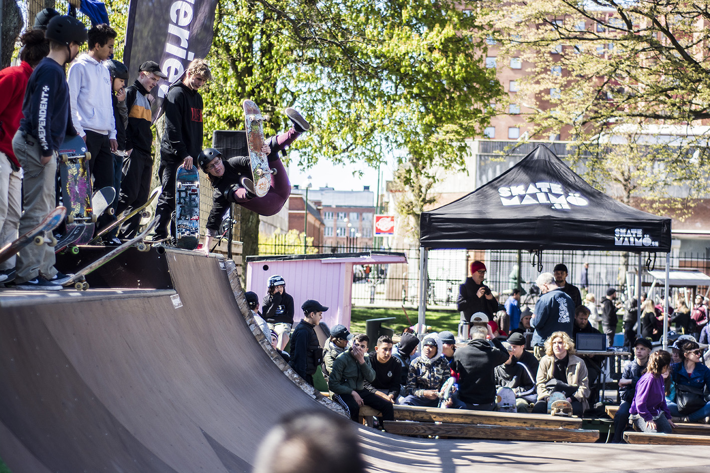 Tävlingsmomentet kan förvirra mig lite när det gäller skateboard. Den familjära känslan vid arrangemangen gör att känslan av ”motståndare” är minimal. Ja, mer än antagonister verkar de tävlande vara kompisar. Säg att någon sätter ett trick för allra första gången.. Det behöver inte vara top notch eller så himla superavancerat, men glädjen och uppskattningen går inte att ta miste på, varken hos publiken eller medtävlarna. Den här speciella generositeten man visar inför varandras prestationer är fin. Hur man stöttar och ger varandra support. Sedan förstås njutbart med de konstfärdigheter som de mest avancerade åkarna bjuder på. I båda fallen blir det liksom något annat än tävling och konkurrens. Mer konst, ett förfinat individuellt uttryck. I ett kollektiv där alla ges samma värde. Och som så ofta vid skateboardevenemang landar allt i en go anarkistisk atmosfär med bra musik i högtalarna. Så det var faktiskt som att dimpa ner i ett miniatyrparadis i den milda vårsolen i Folkets Park. På ett par timmars betryggande avstånd från kvällens hektiska och överbefolkade Valborgsfirande.