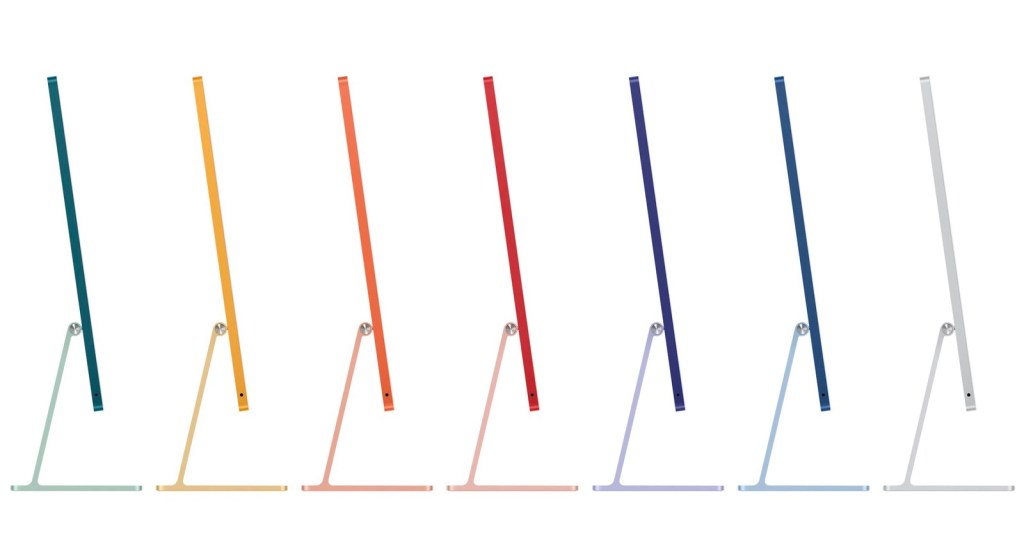 – Försvinnande tunn iMac på 24”. Mindre sorgekanter, men ”hakan” nedtill är kvar. Kommer i färger precis som iMac 1998. Bestyckad med nya M1-processorn.