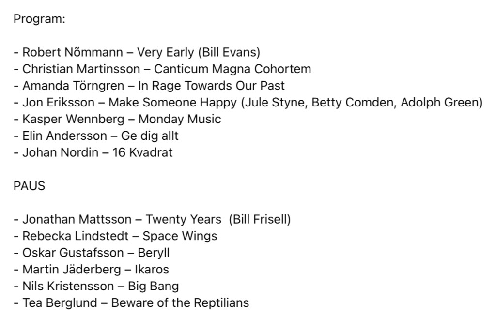 Ska sägas att det under den nästan två timmar långa konsertkvällen också fanns andra låtar som var spännande. Så lyssna på hela middevitten. Konsertprogrammet i sin helhet nedan.