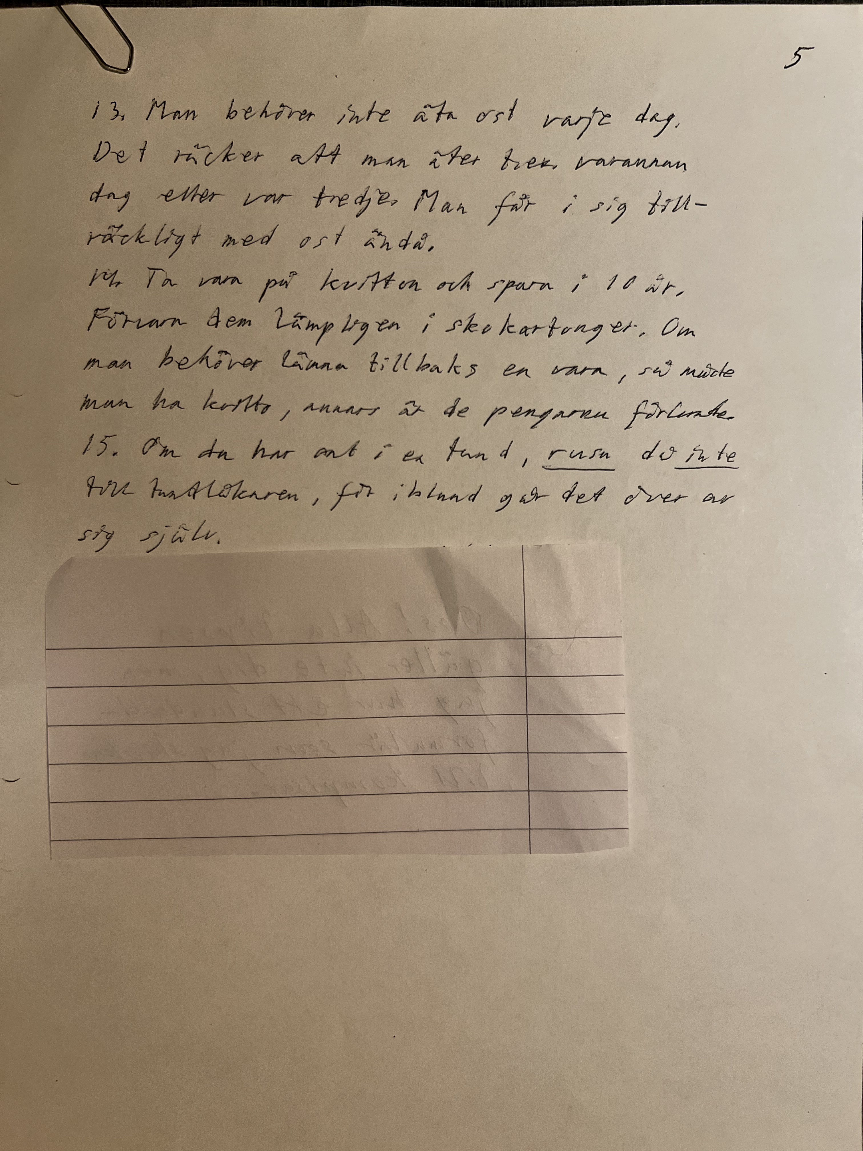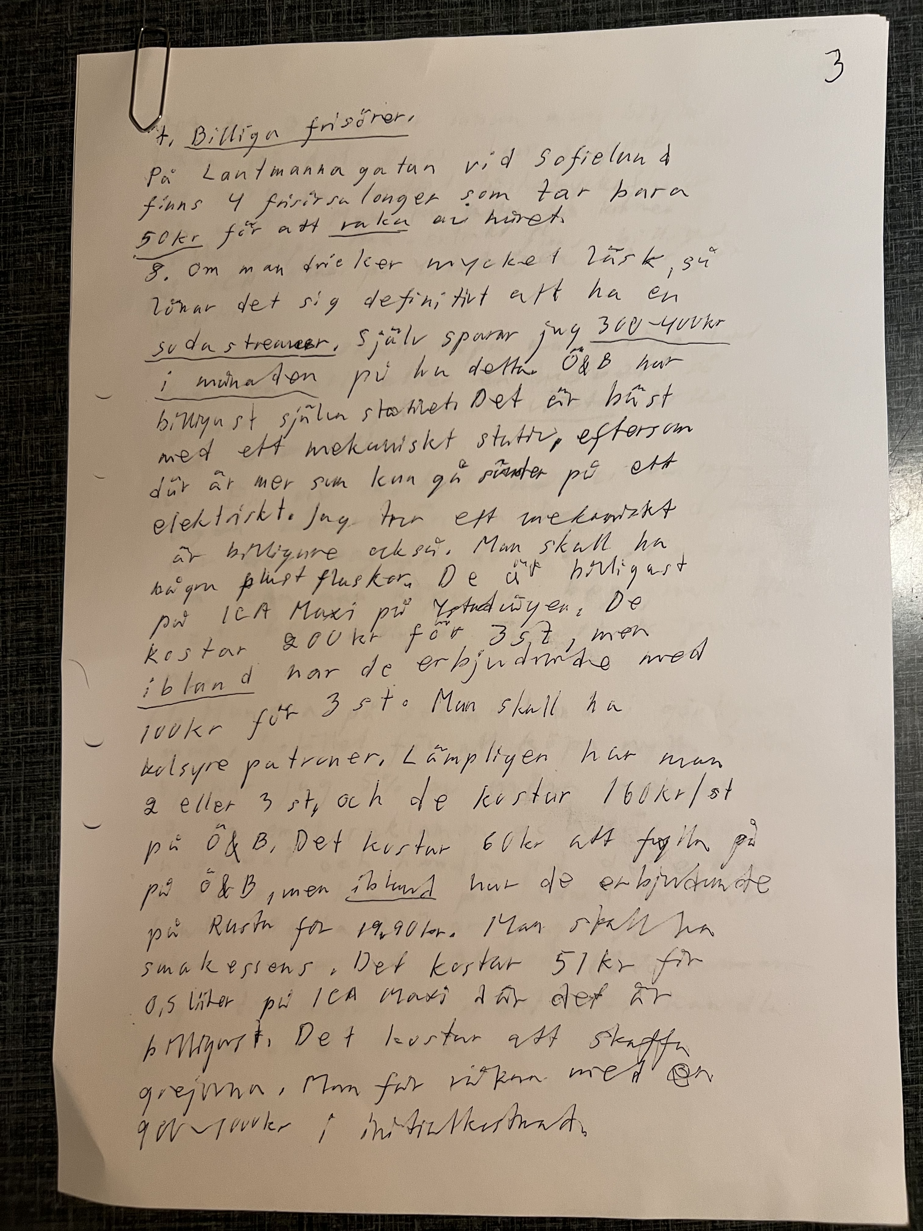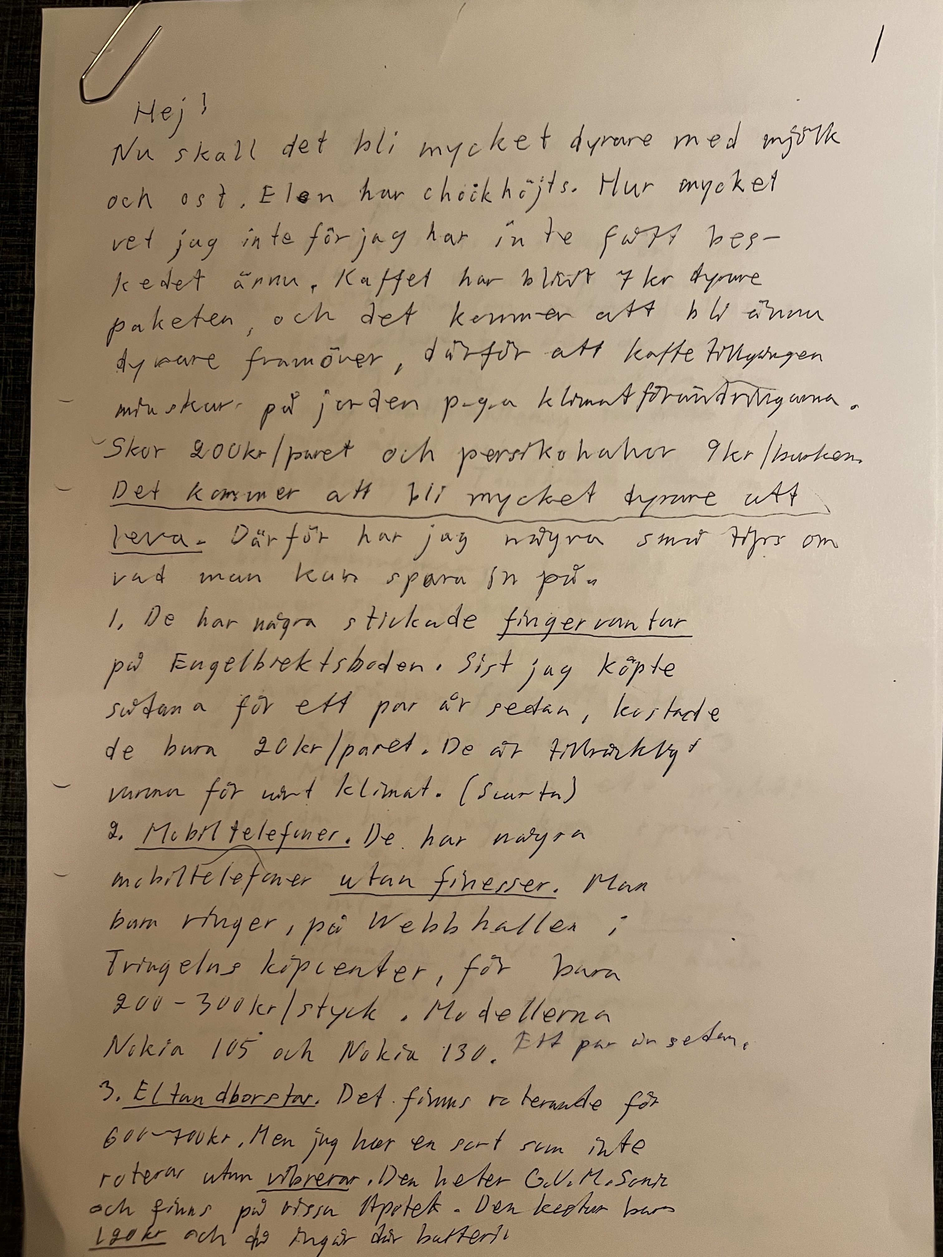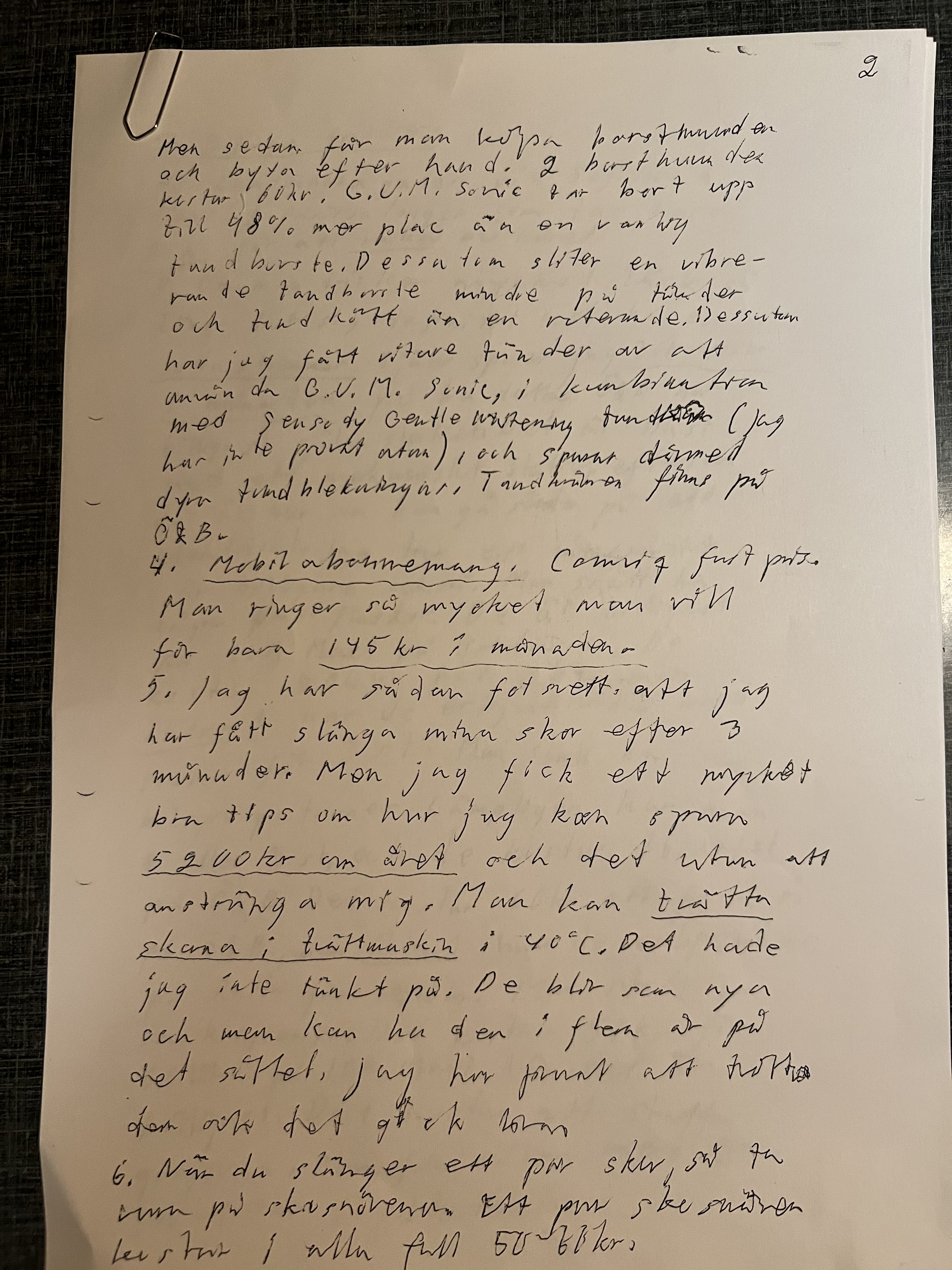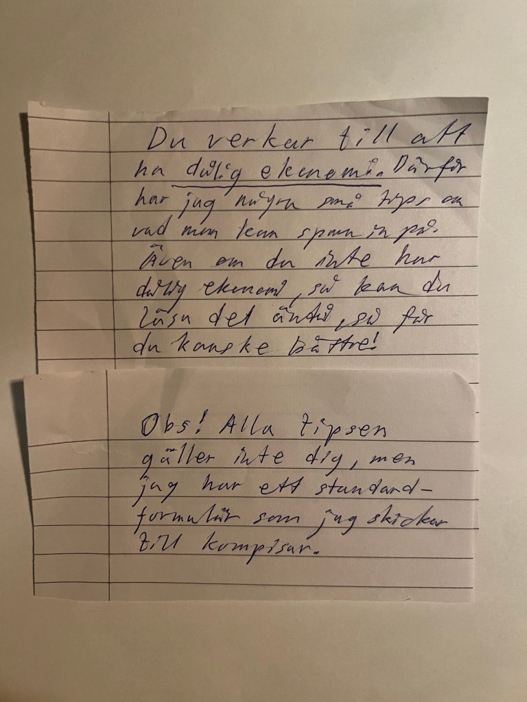 Han hade skrivit sitt namn och sin adress på baksidan av kuvertet. En liten handskriven lapp var fäst med ett gem på detsamma. Och ytterligare en liten lapp var häftad vid brevet inuti. Så vad bestod detta brev av? Jo, av fem sidor med personligt färgade tips för ett billigt leverne. In alles 15 tips och goda råd om var man t.ex. kan köpa billiga vantar, eltandborstar och sodastreamers (!), var man handlar billigaste mobiltelefonen, varför man ska köpa secondhand framför nytt, och varför man alltid ska läsa reklambladen. Och mycket mer!