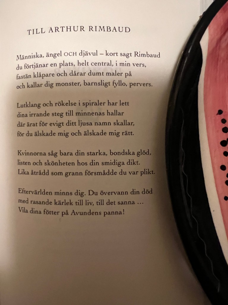 Mer läsande. Fick en fin liten bok med dikter av Paul Verlaine av en trevlig kvinna som hade besökt bokmässan i Göteborg. Upplever väl Verlaines dikter som lite mossiga, men kommer liksom in i det, hittar tonen och lyckas läsa honom med min ungdoms ögon, ungefär som jag någongång kan läsa Rimbaud. De där 1800-talspågarna tilltalade en. Verlaine var ju en självutnämnd poète maudit, en ”fördömd poet”, utstött av samhälle och normer. Sånt gillade man, och fortsätter att göra. Tror ett hälsotecken. Så ett kärt återseende ändå, och visst och somt är ganska bra. Här hans dikt om boyfrienden Rimbaud som han sköt i foten på fyllan, och fick två års fängelse för. Ja, det och homosexualiteten.
