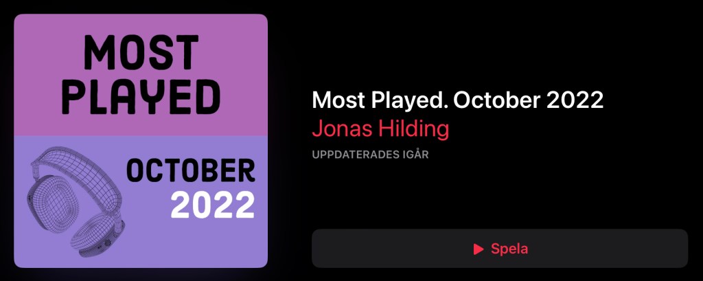 November är snart här och Music meddelade igår – den sista söndagen i månaden – att mina mest lyssnade låtar (Top-100) för oktober var dessa: