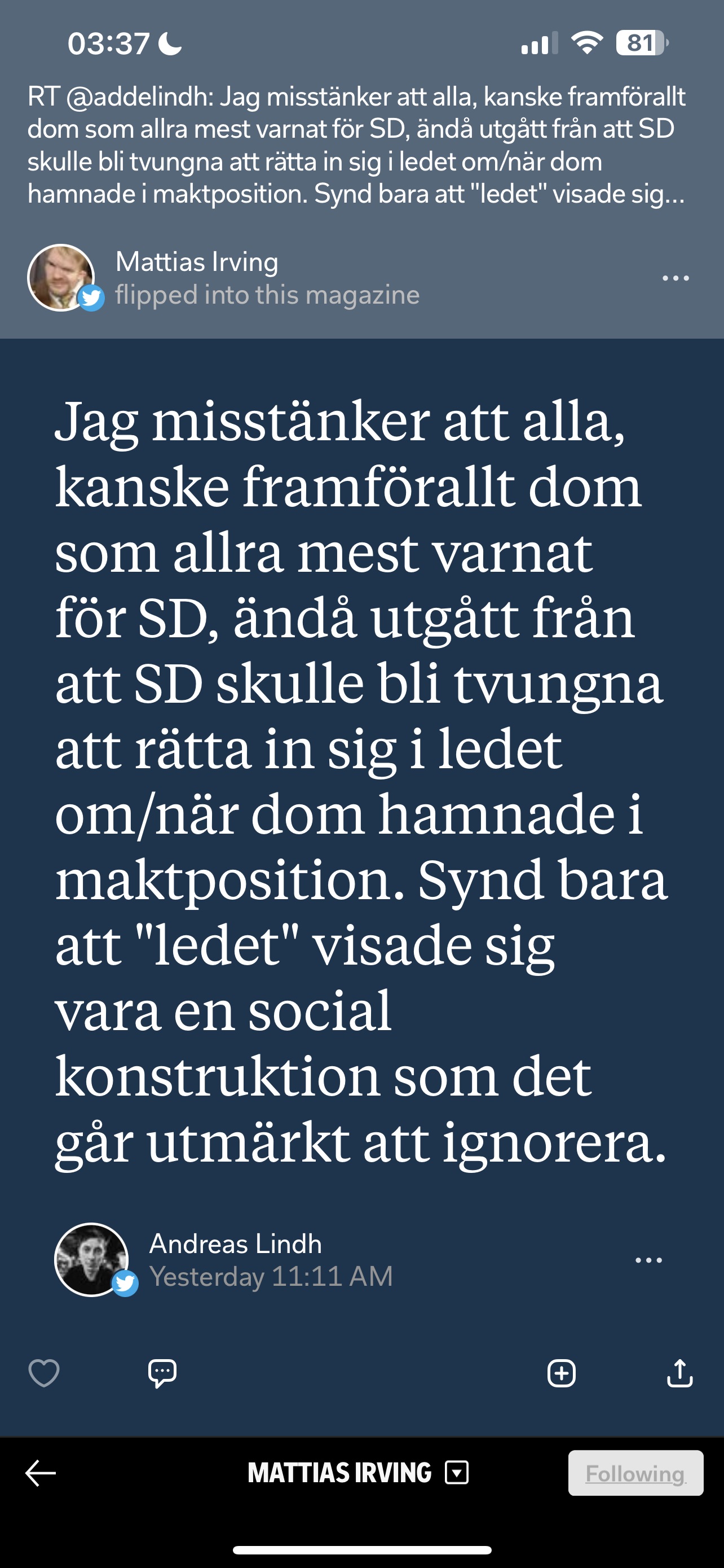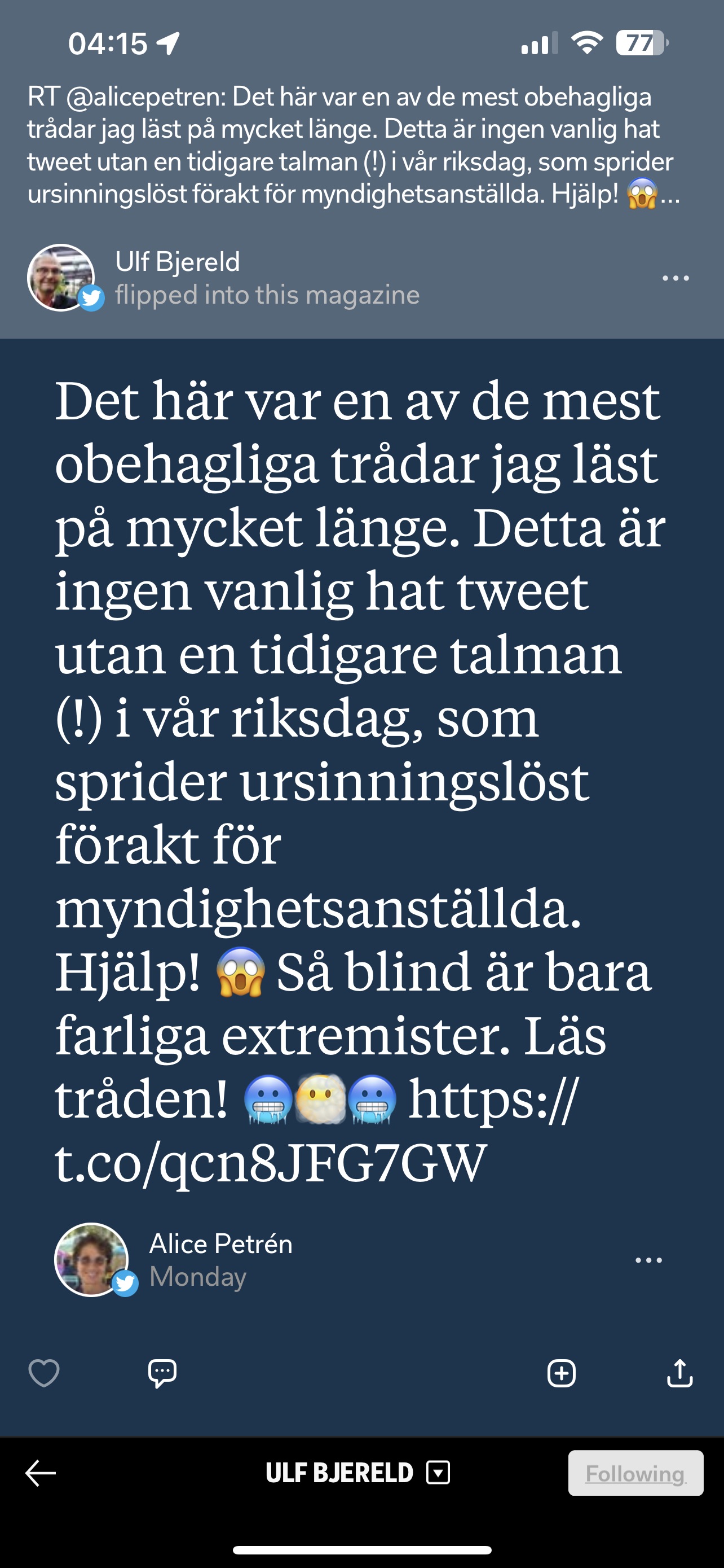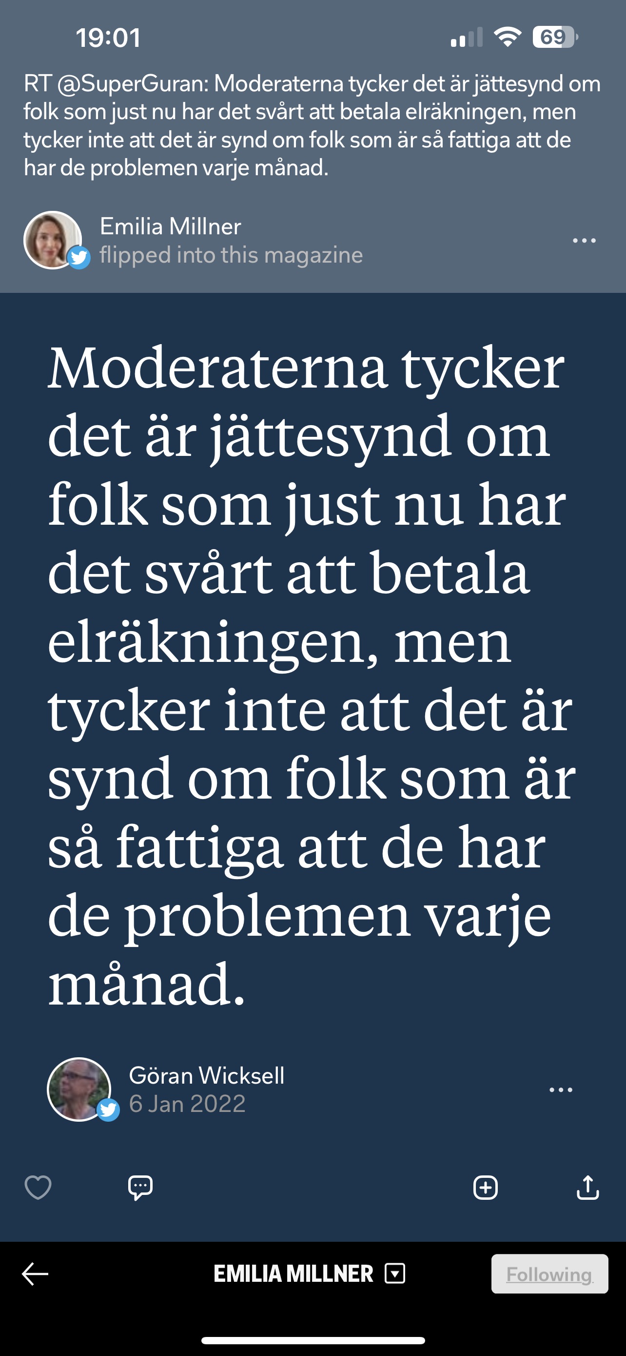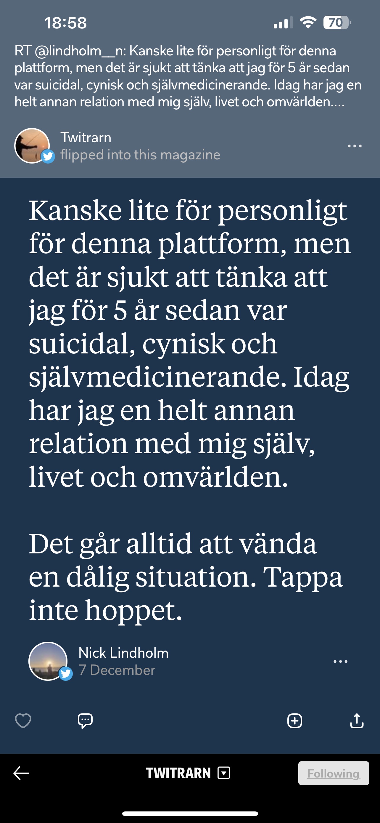 Jag har kommit att använda Flipboard enbart för twitterkonton. Ett plus (oftast) är att man bara får upp originaltweetsen och inte kommentarerna. Du får så att säga ta del av någons tankegods, men slipper det efterföljande babblet. Skulle en ändå vilja läsa andras reaktioner, eller ta del av en oväntat intressant tråd – så är det bara att växla över till Twitter-appen direkt från Flipboard och läsa vidare.