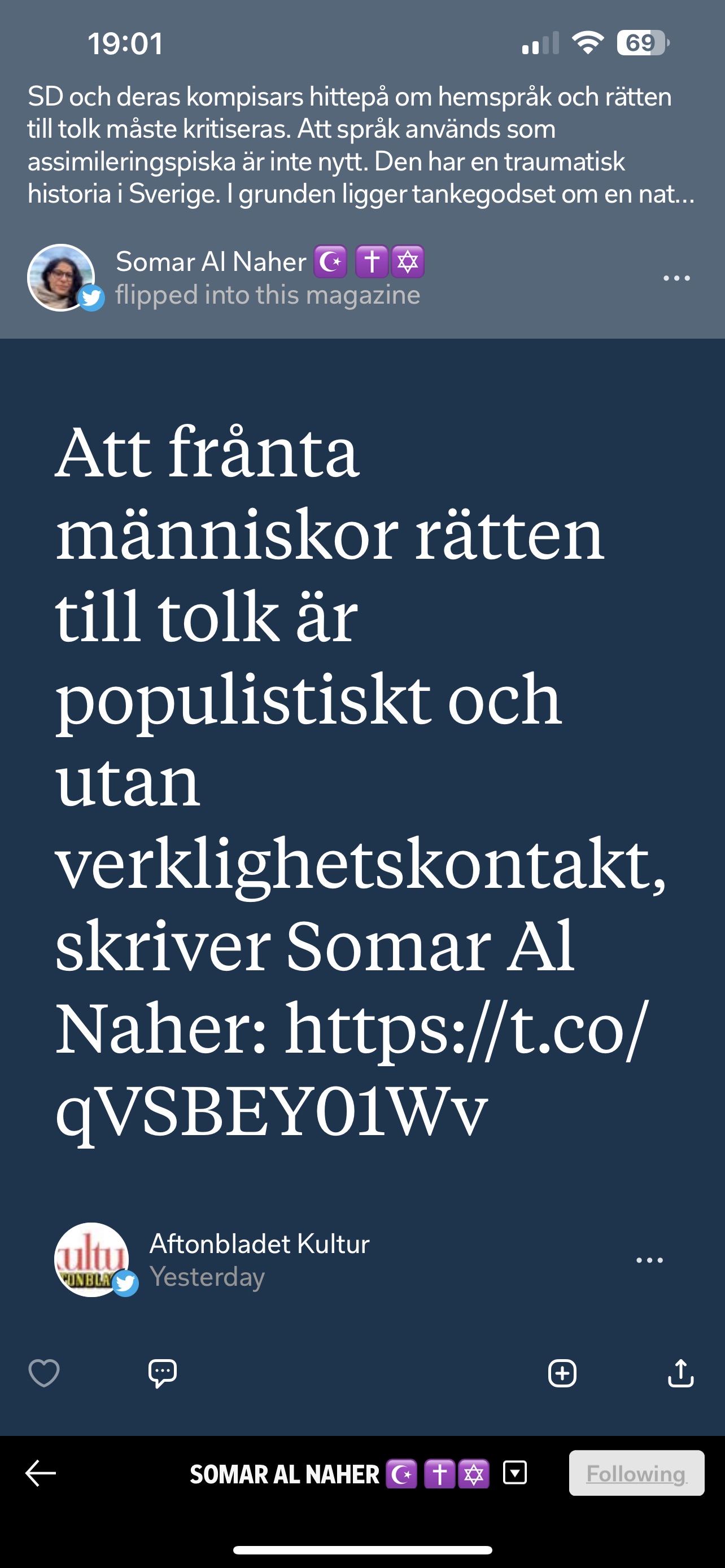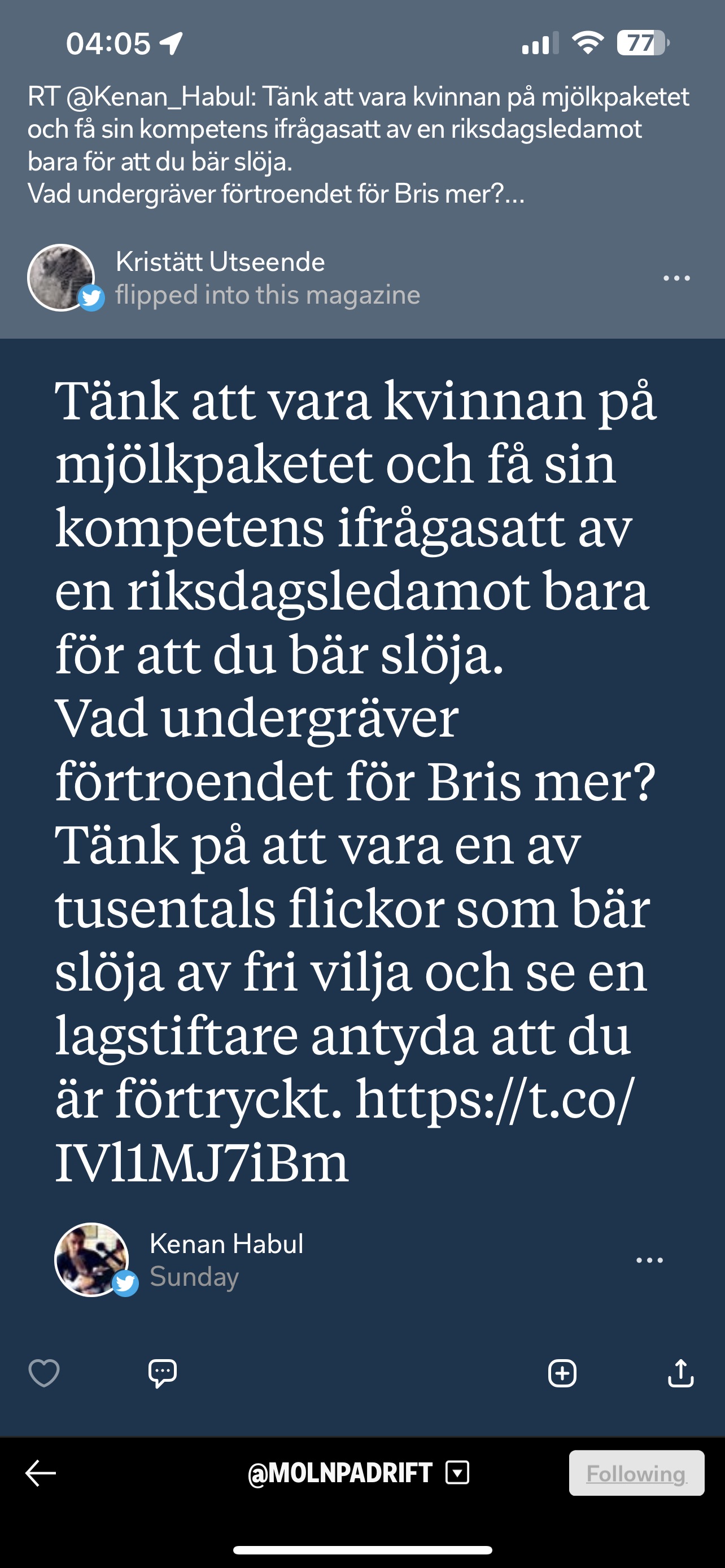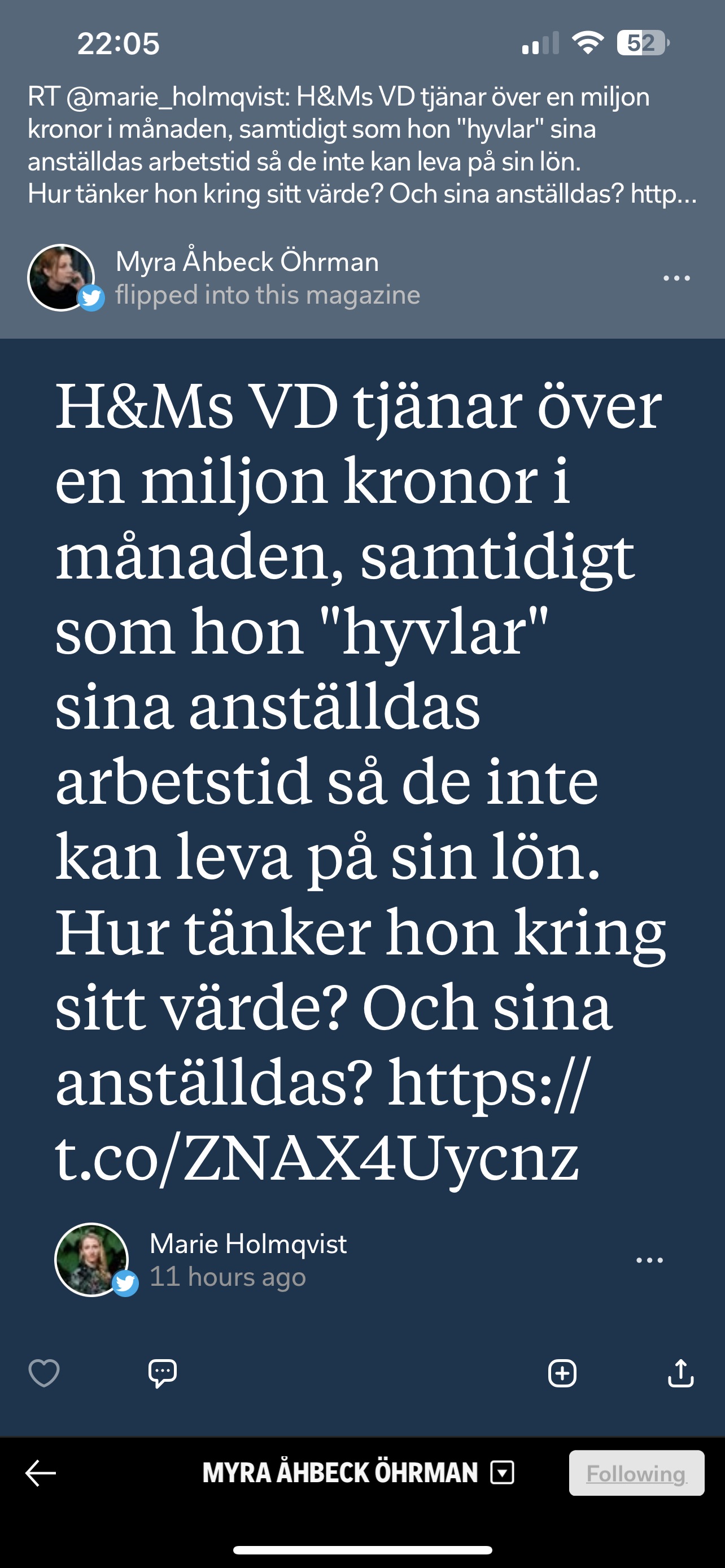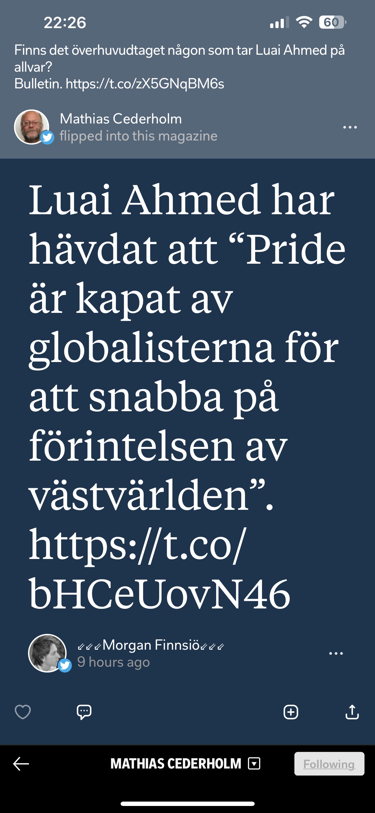 Jag har kommit att använda Flipboard enbart för twitterkonton. Ett plus (oftast) är att man bara får upp originaltweetsen och inte kommentarerna. Du får så att säga ta del av någons tankegods, men slipper det efterföljande babblet. Skulle en ändå vilja läsa andras reaktioner, eller ta del av en oväntat intressant tråd – så är det bara att växla över till Twitter-appen direkt från Flipboard och läsa vidare.