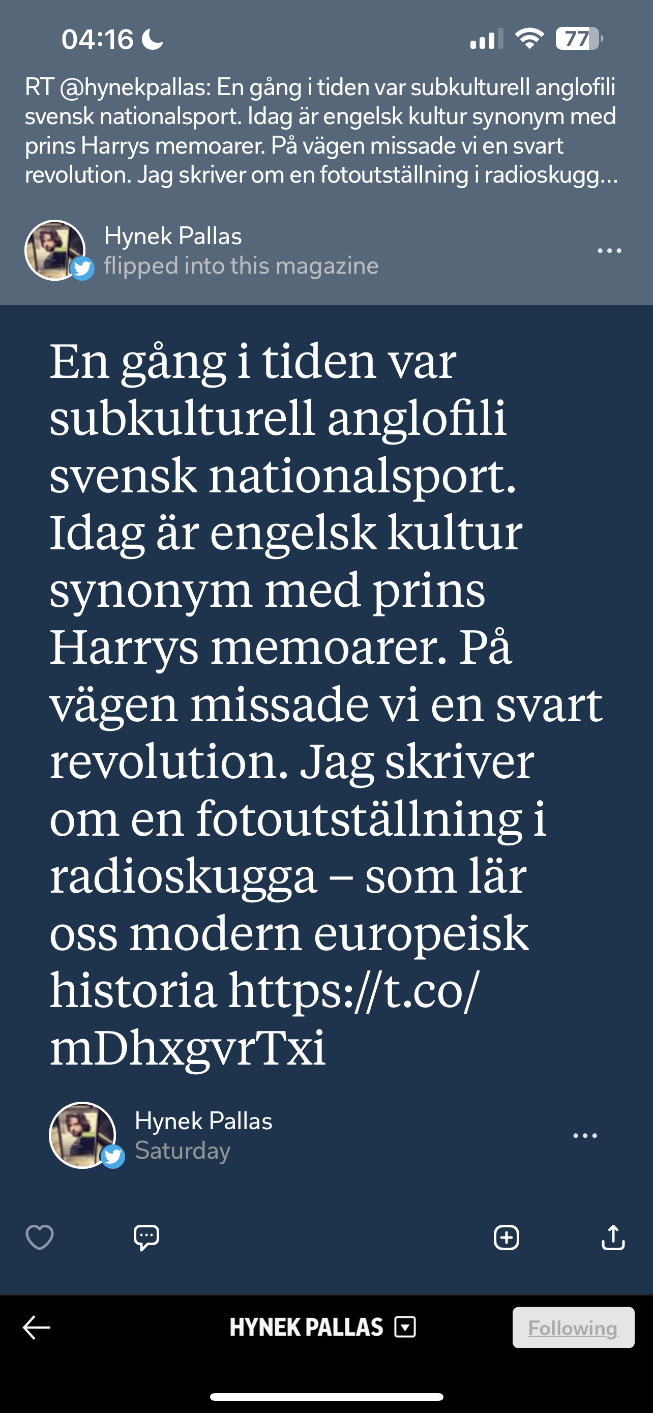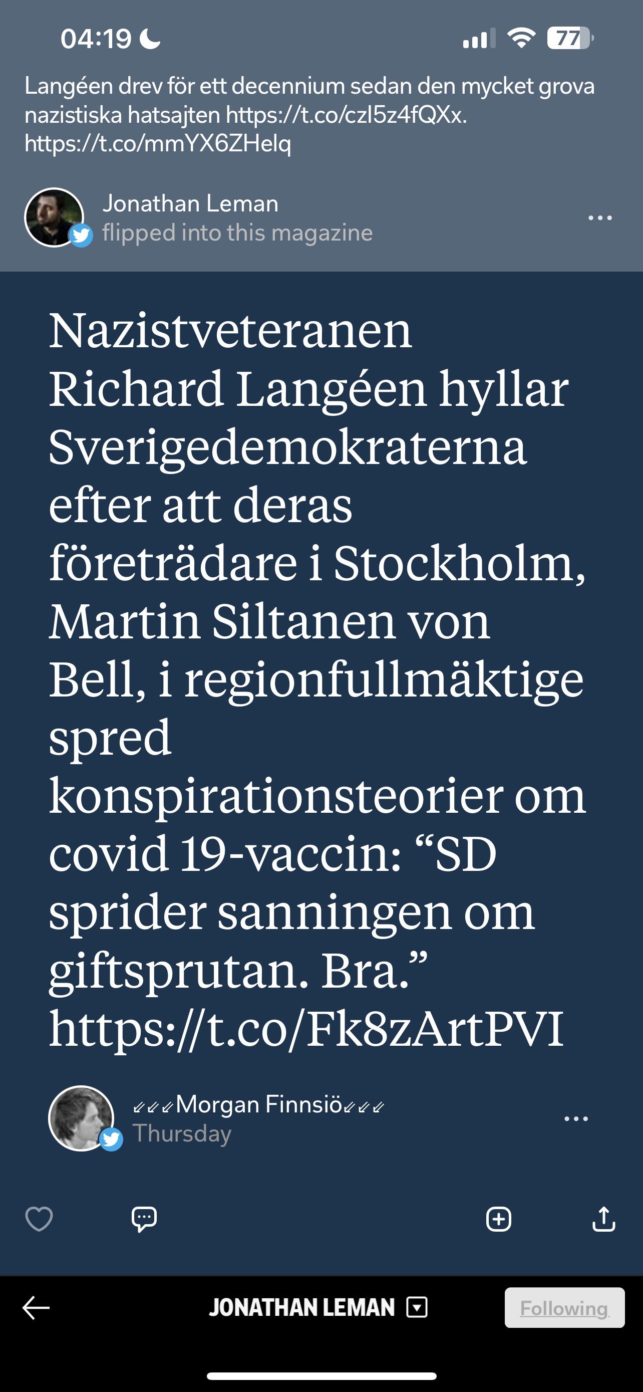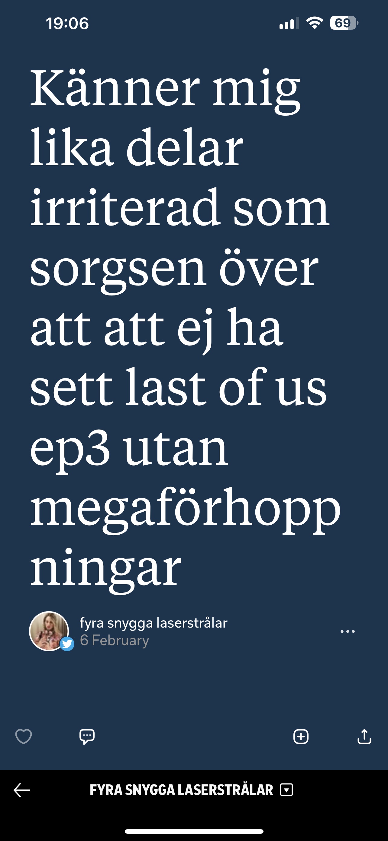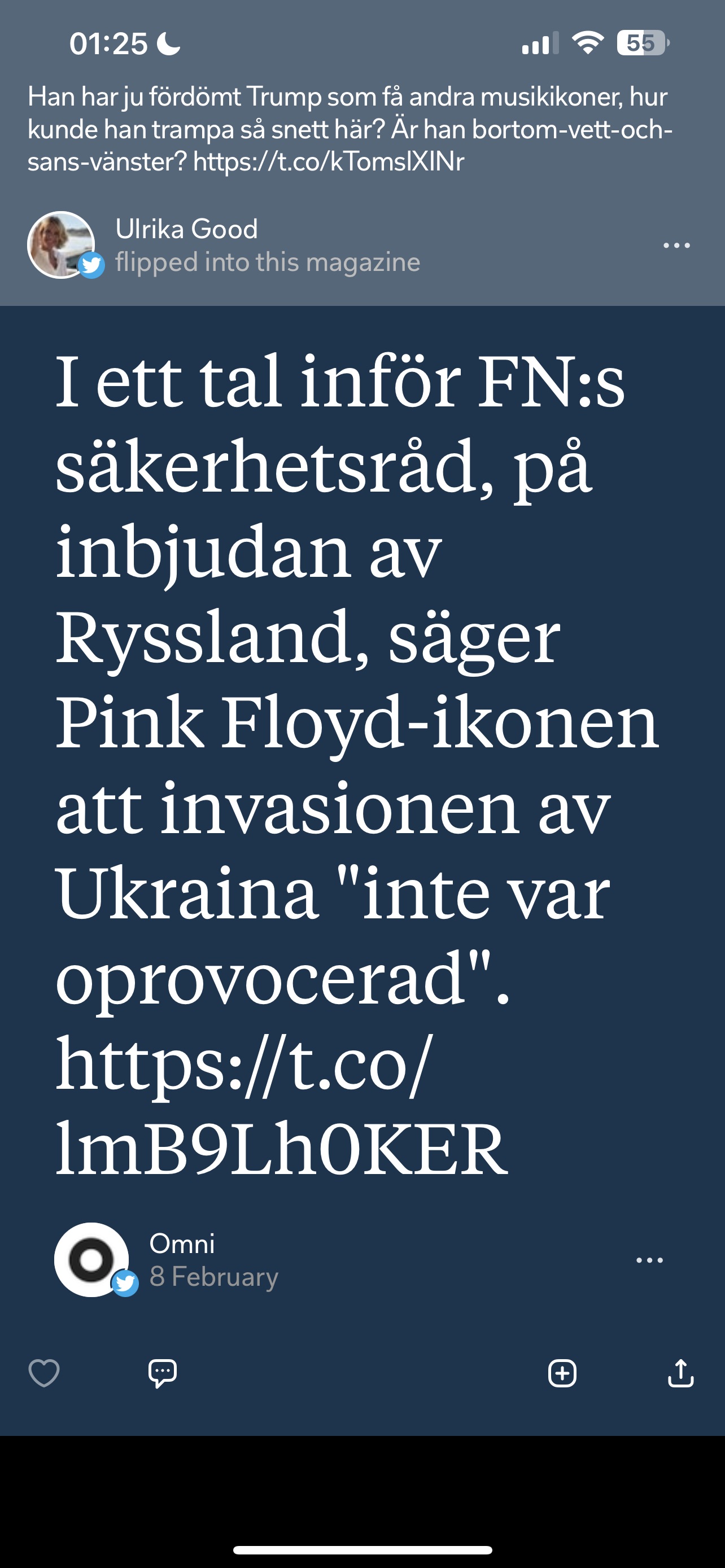 Jag har kommit att använda Flipboard enbart för twitterkonton. Ett plus (oftast) är att man bara får upp originaltweetsen och inte kommentarerna. Du får så att säga ta del av någons tankegods, men slipper det efterföljande babblet. Skulle en ändå vilja läsa andras reaktioner, eller ta del av en oväntat intressant tråd – så är det bara att växla över till Twitter-appen direkt från Flipboard och läsa vidare.