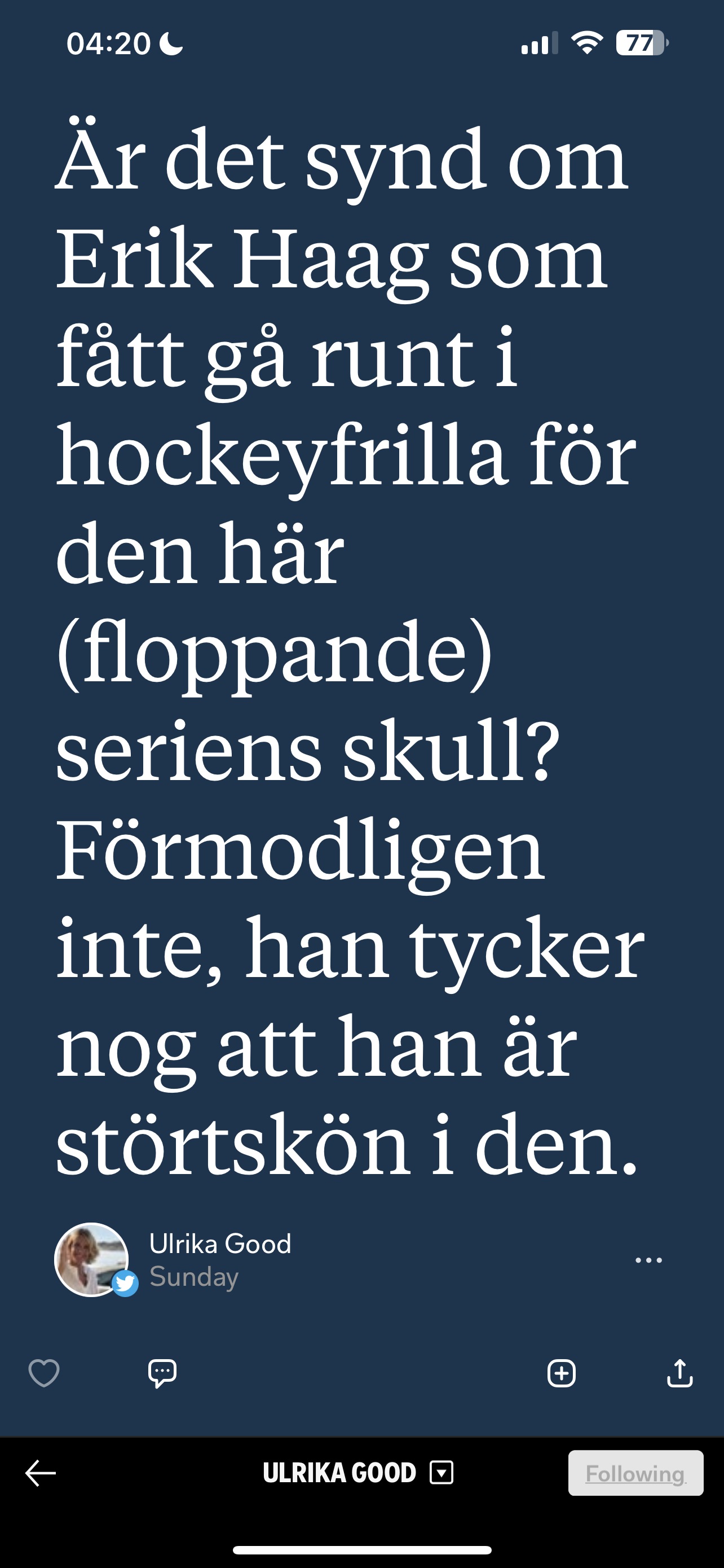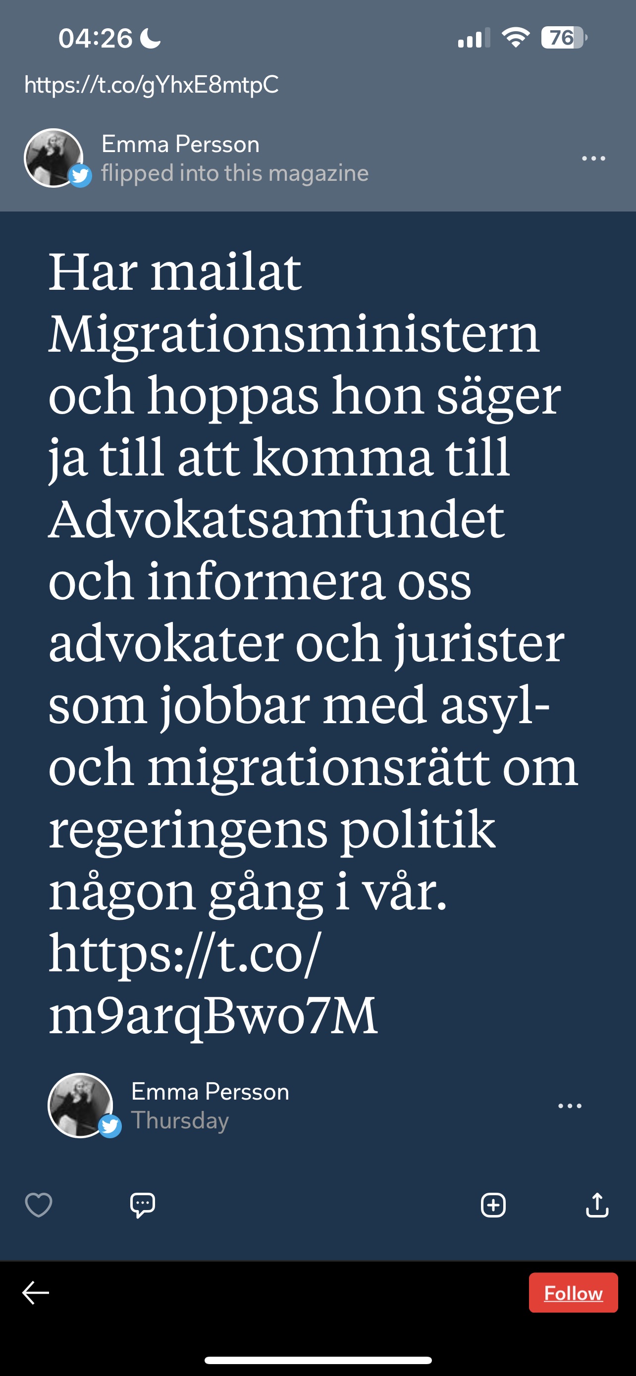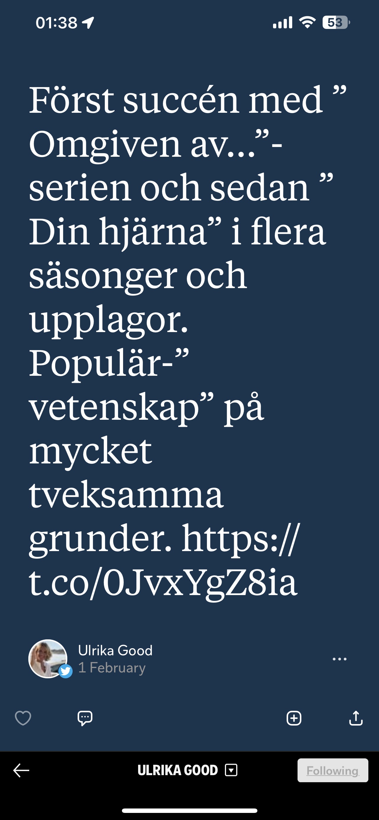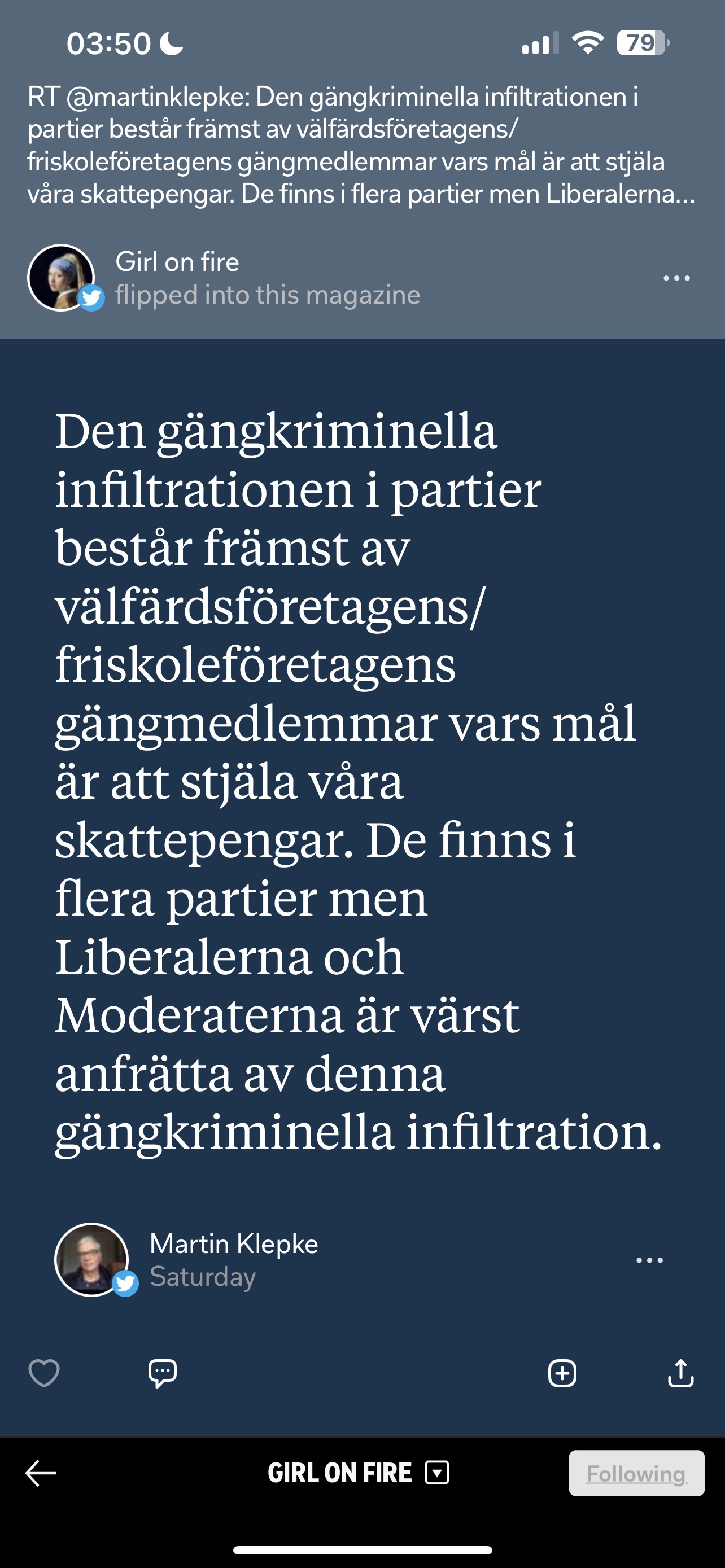 Jag har kommit att använda Flipboard enbart för twitterkonton. Ett plus (oftast) är att man bara får upp originaltweetsen och inte kommentarerna. Du får så att säga ta del av någons tankegods, men slipper det efterföljande babblet. Skulle en ändå vilja läsa andras reaktioner, eller ta del av en oväntat intressant tråd – så är det bara att växla över till Twitter-appen direkt från Flipboard och läsa vidare.