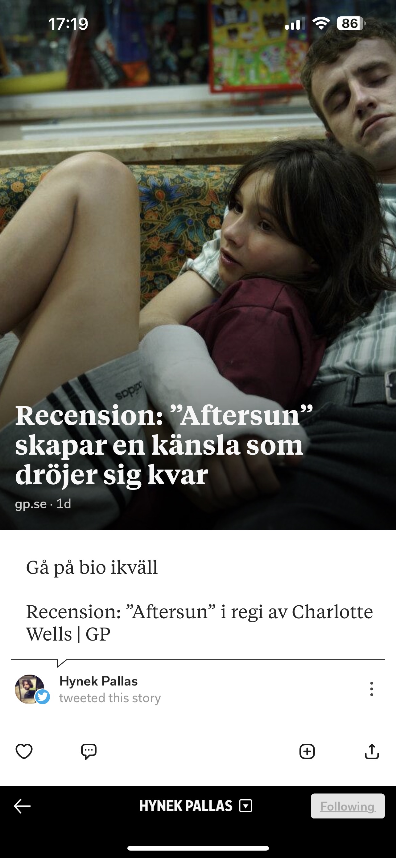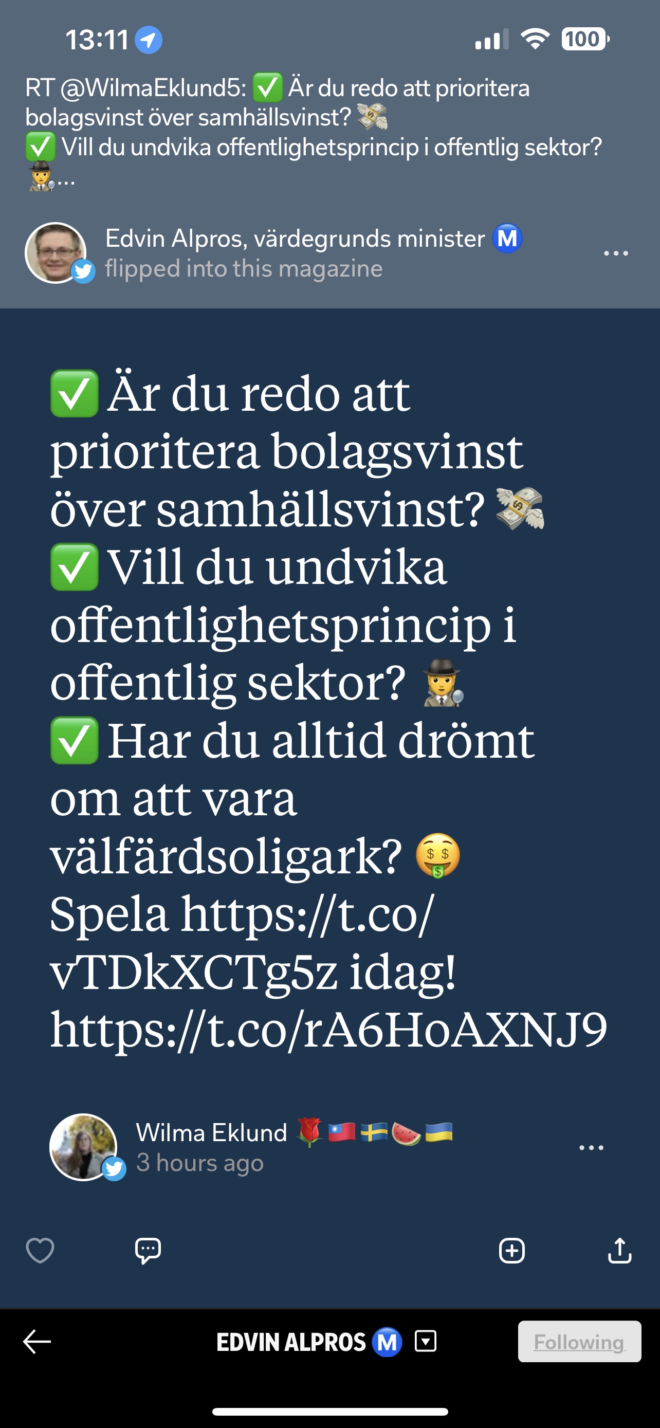 Har sovrat fram mina favorit-twittrare med tiden och lagrar dem i utomordentliga appen Flipboard. Det är en app som låter dig samla innehåll från sociala nätverk, nyhetspublikationer och bloggar. Sedan presenterar den innehållet i ett ”tidningsliknande format” (nåja, mer modern swipebläddring med klassisk bladvändareffekt). Användare har möjlighet att skapa sina egna ”tidningar” samt prenumerera på andra användares. Går också att följa ämnen från färdigkureterade samlingar med nyheter om specifikt ämne eller intresseområde. Oftast lite b, men kan ju kanske vara bra.