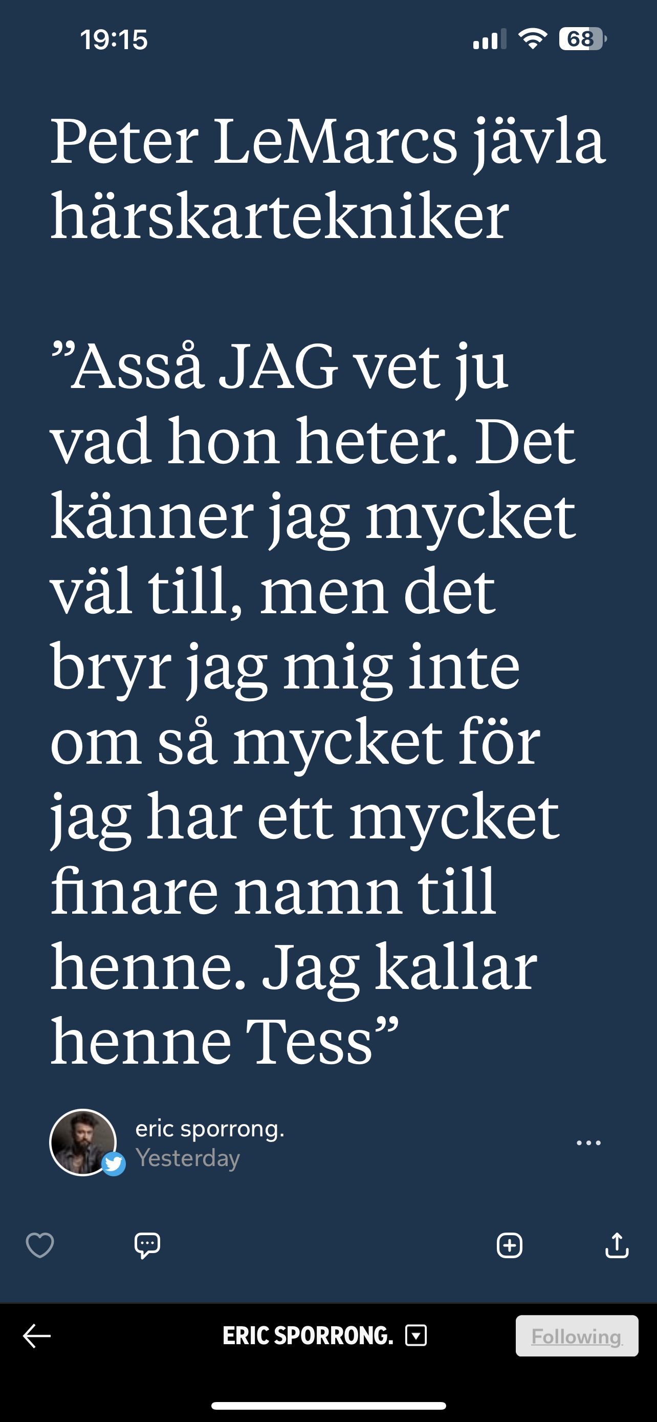 Jag skriver inte på twitter, men följer väl runt 500 personer världen över som gör. Så jag har ett konto där sedan många år.