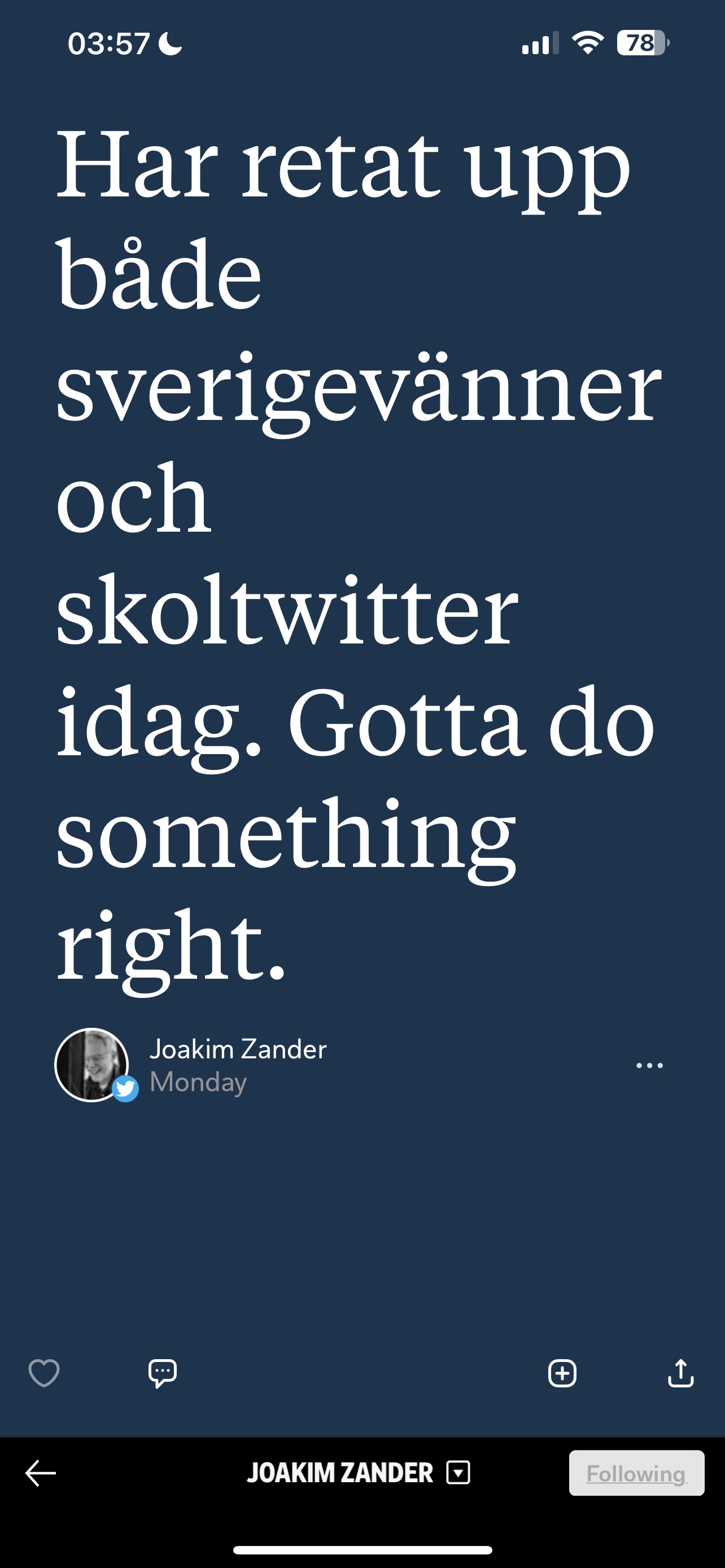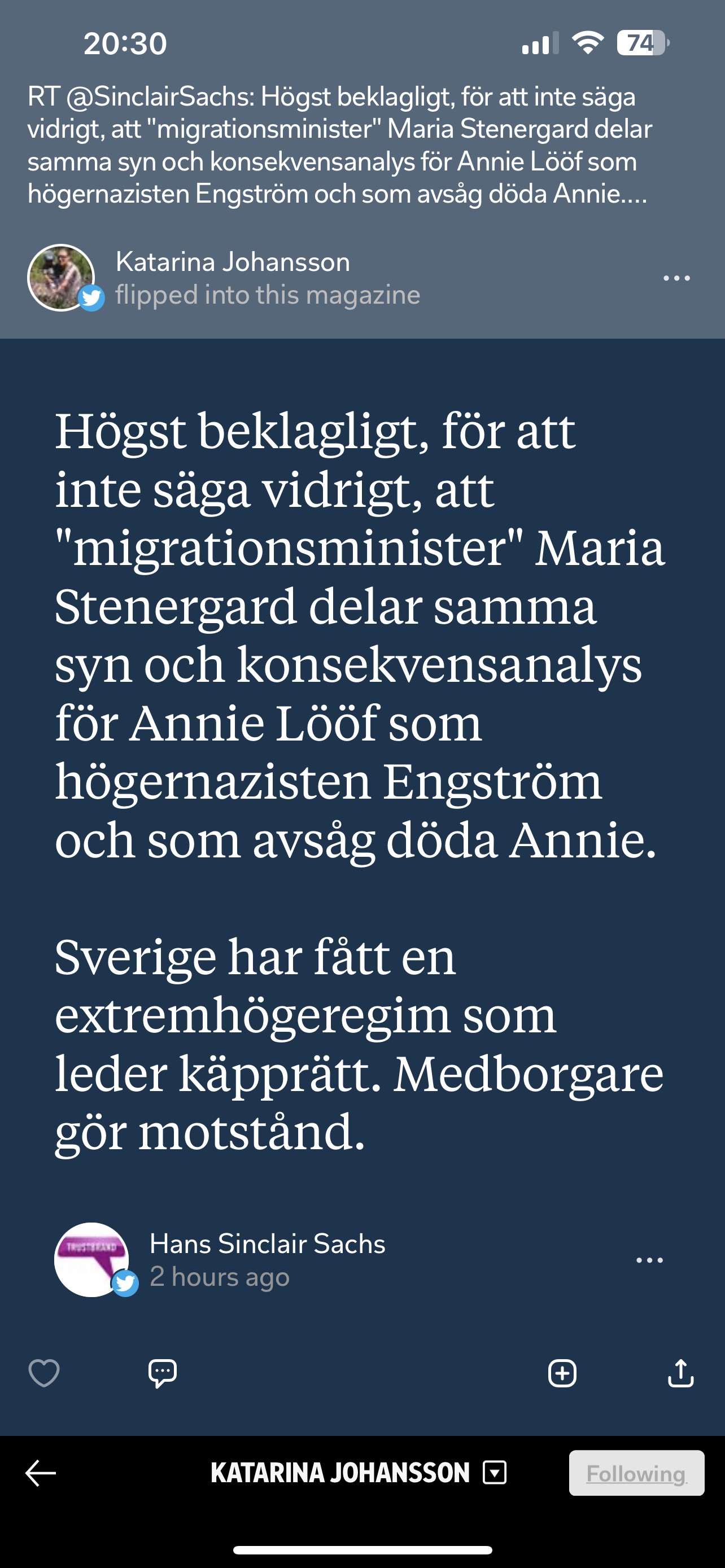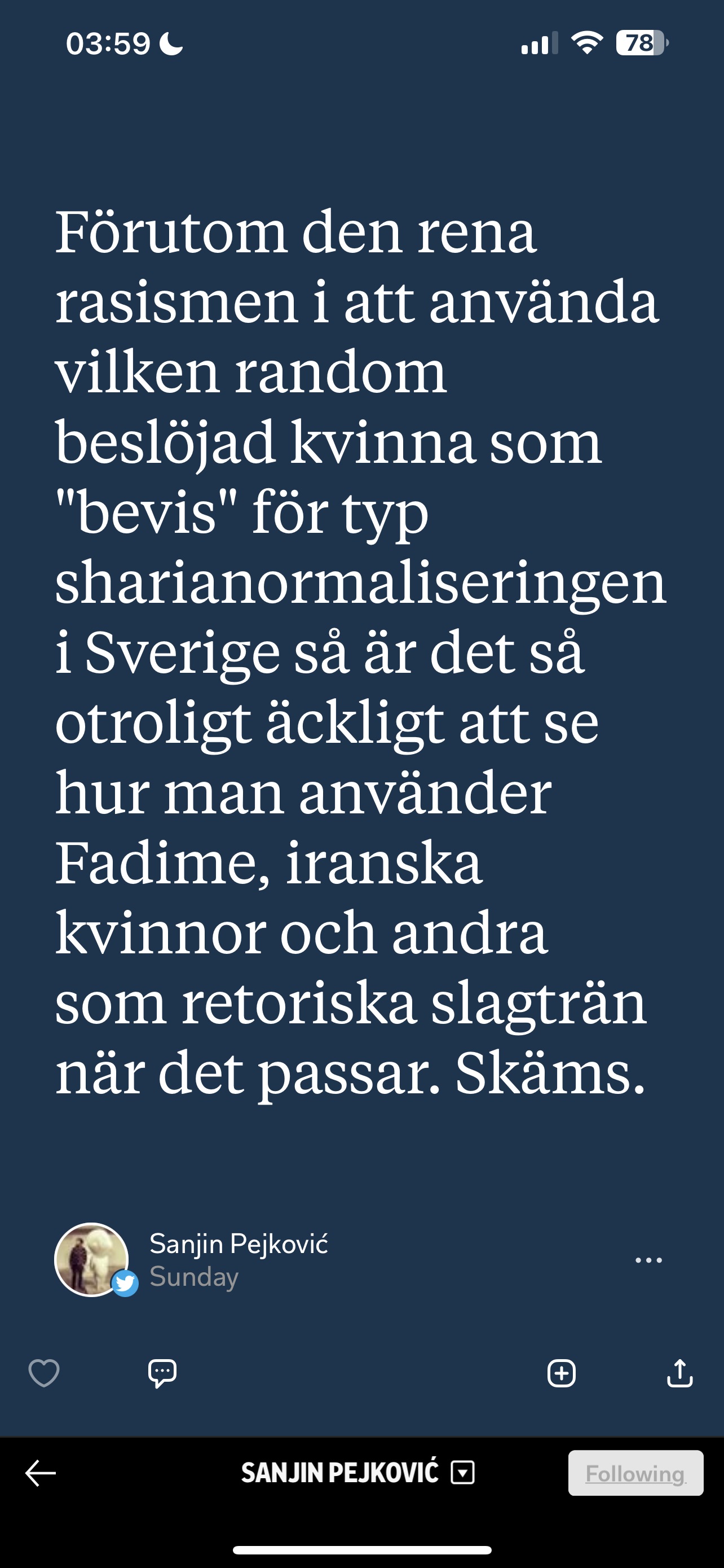 Känner förresten stor uppskattning över vissa segment av den svenska twittervärlden just nu, Tänker främst på de samhällsengagerade röster som bemöter den högernationalistiska dumheten dagarna i ända. Det är egentligen både lite skrämmande och en välsignelse att ni så ståndaktigt mäktar med att ta in och spotta ut, levererar kloka synpunkter och personliga utsagor, länkar till egna och andras artiklar. Visar på motstånd, riktning och väg. Så tack för att ni förmedlar, förfäras, reagerar och analyserar.