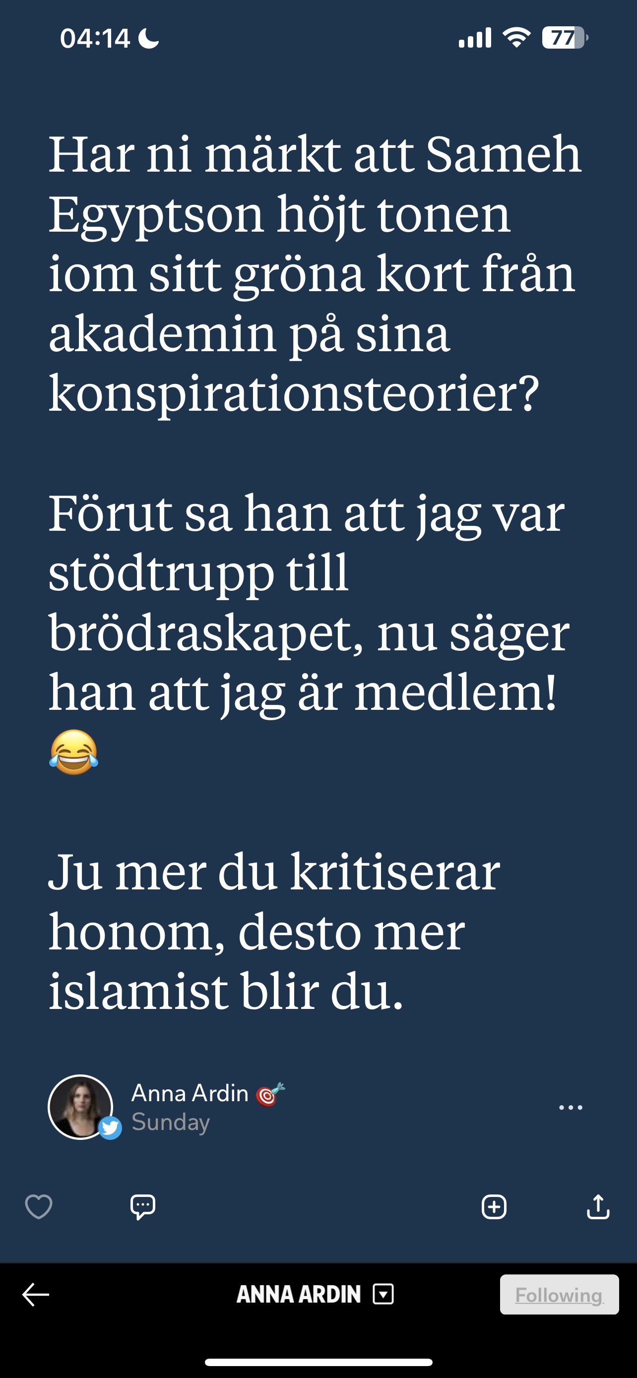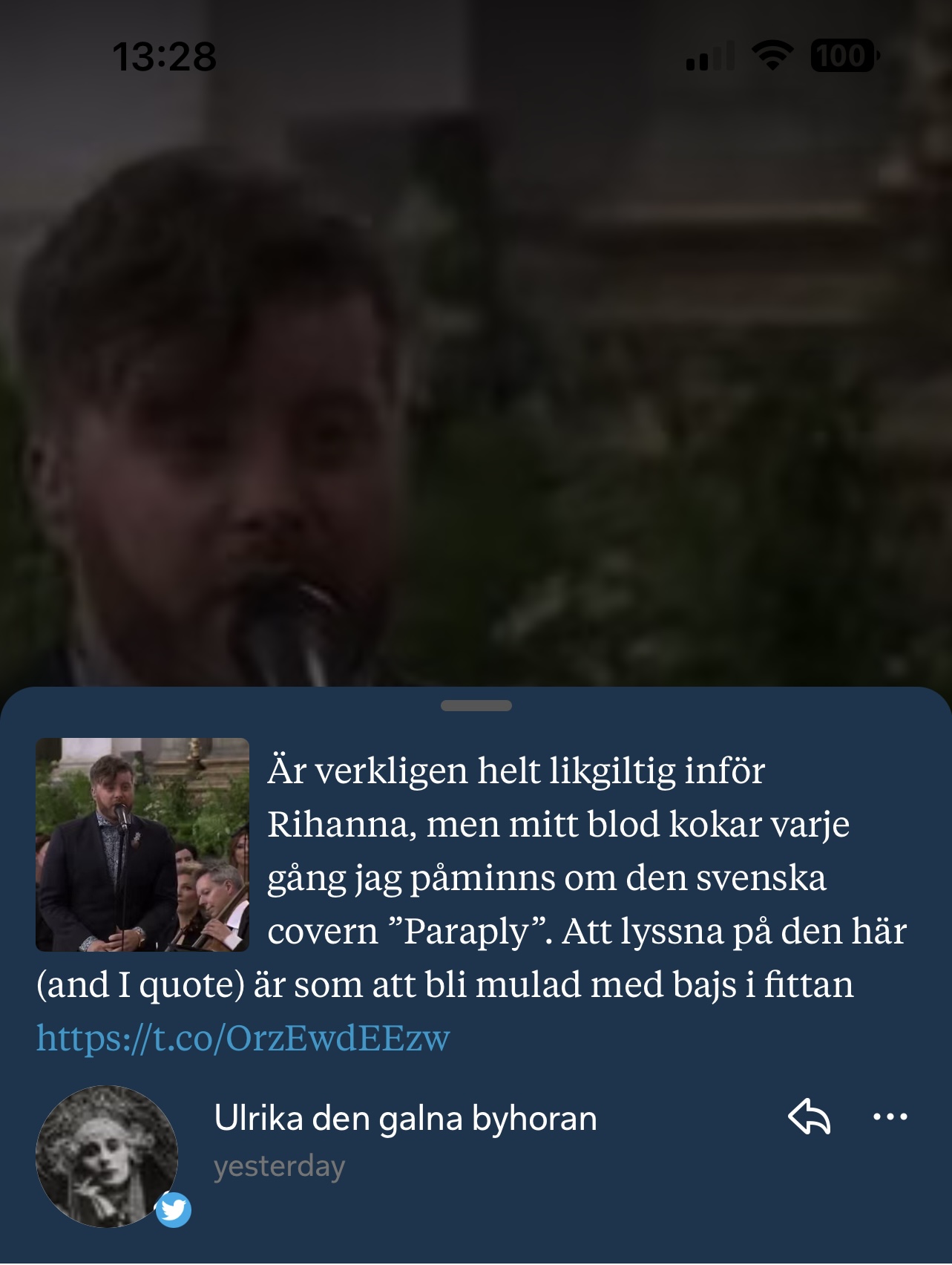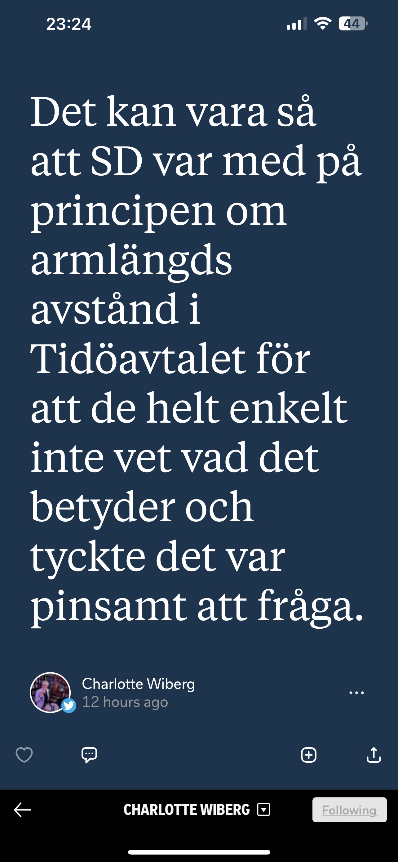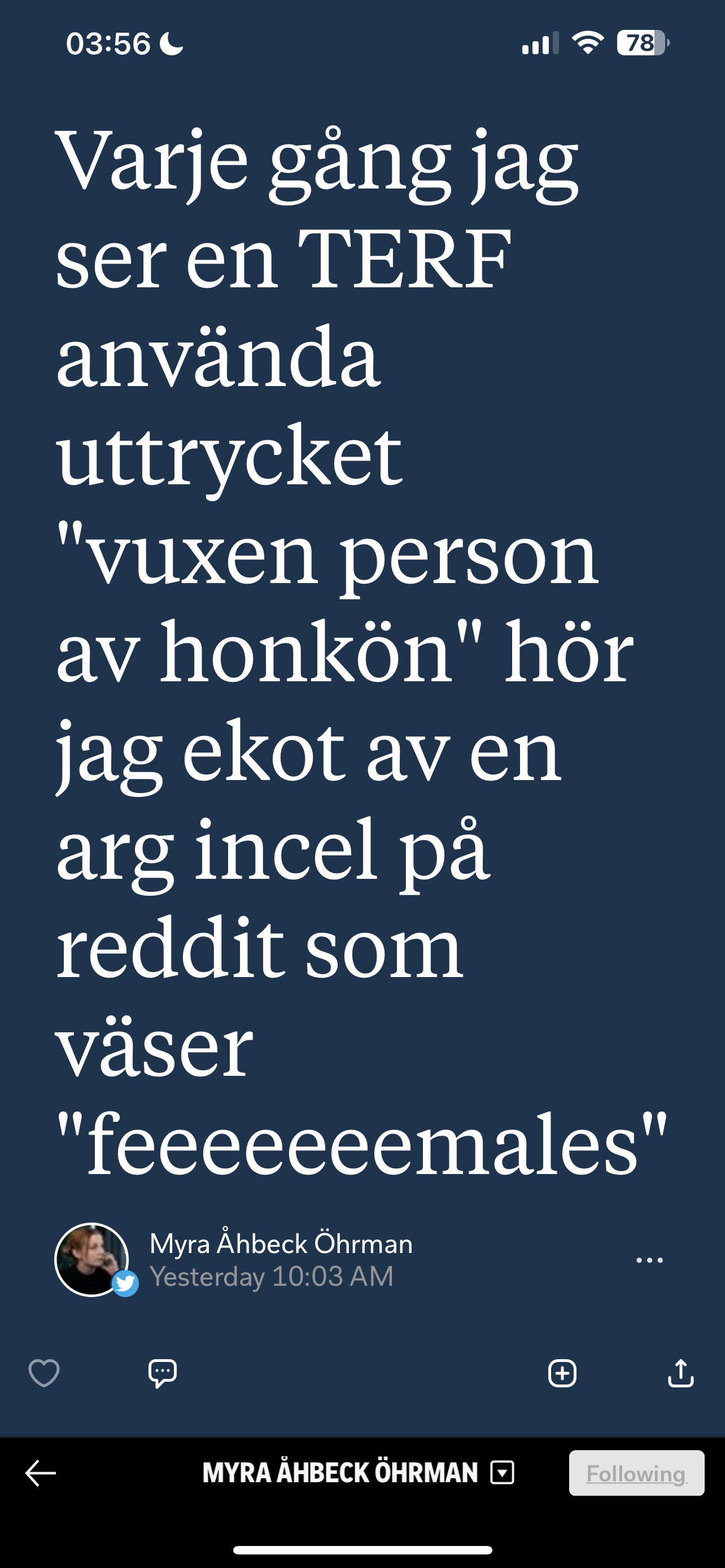 Känner förresten stor uppskattning över vissa segment av den svenska twittervärlden just nu, Tänker främst på de samhällsengagerade röster som bemöter den högernationalistiska dumheten dagarna i ända. Det är egentligen både lite skrämmande och en välsignelse att ni så ståndaktigt mäktar med att ta in och spotta ut, levererar kloka synpunkter och personliga utsagor, länkar till egna och andras artiklar. Visar på motstånd, riktning och väg. Så tack för att ni förmedlar, förfäras, reagerar och analyserar.