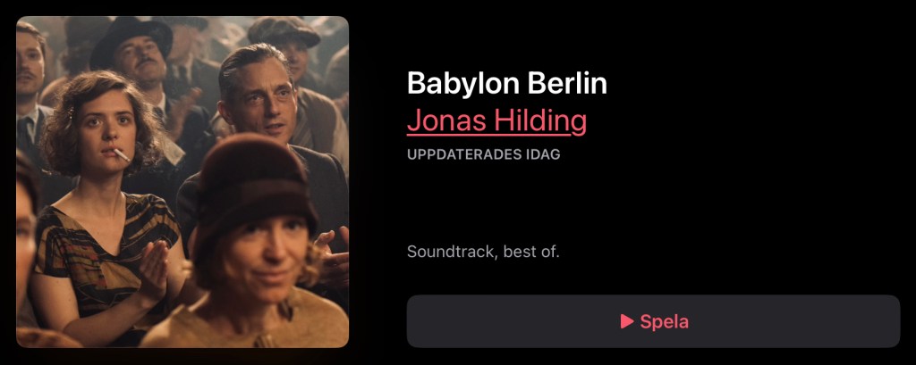 Tre album med soundtracket finns att tillgå. Jag har sovrat ikväll. Kokat ner 90 tillgängliga spår till 40 i en Best Of Babylon Berlin spellista på Spotify och Music (Spotify lyckades bara matcha 37 spår).. So. Wählen Sie also natürlich Apple Music für die vollständige Liste.