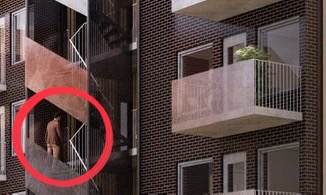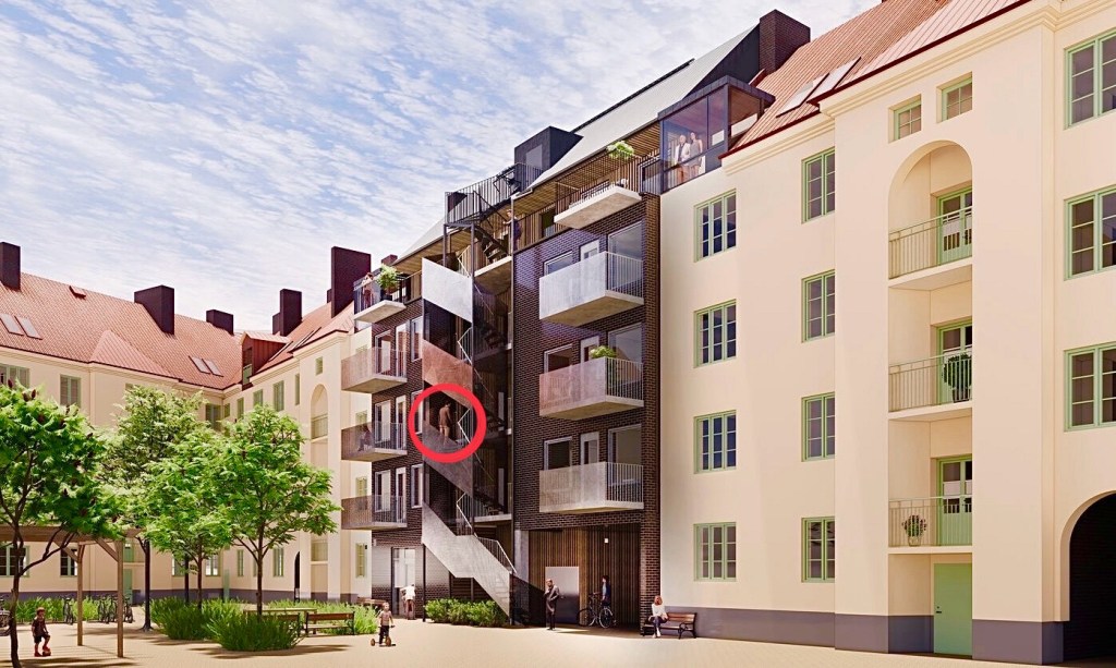 Notera mannen med den väldefinierade stjärten, ja utan byxor och kalsonger, men med kavaj (!) från den tänkta virveltrappan på innergården. Det kanske också tillhör visionen för den nya Ensamheten? Det är vad vi har att se fram emot ändå – den nya Nakenheten. Vi kommer helt enkelt att tillåtas att blotta oss och onanera framför våra grannars ytterdörrar i mycket högre grad. Det blir liksom mer ok. Ja, va fan, varför inte! Kostar det så smakar det. Känns ju som en fair deal. Ni bygger ett helt jävla hus utan att fråga om lov – och vi, ja.. Utan att fråga om lov! Sehr Schön.