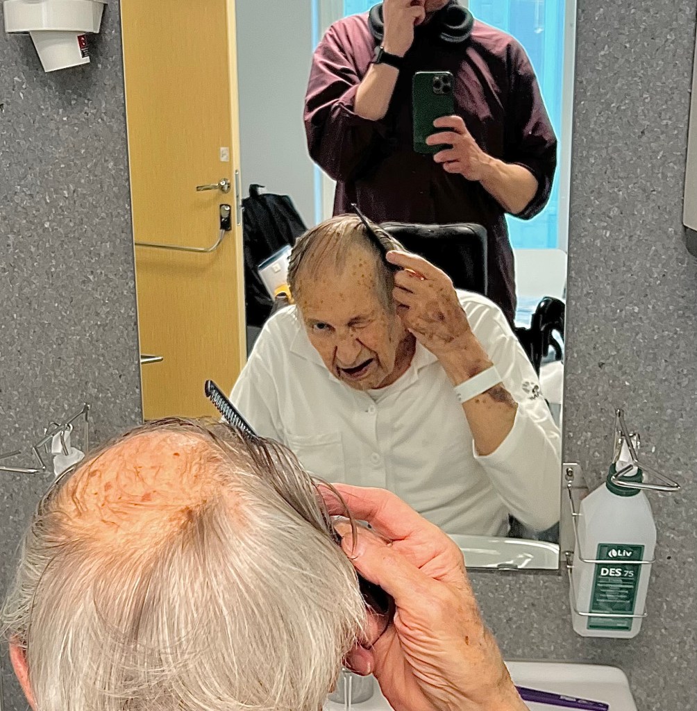 Men alltså – den där geisten pappa har trots att hans dagar är räknade. Den är imponerande. Ett exempel från gårdagen.. Jag stod bakom honom som stöd när han tömde sin kateterpåse i toaletten. Han tvättade sina händer i handfatet efteråt och sedan ville han kamma håret framför spegeln.. Han doppade kammen under vattnet och drog den genom håret. Log i spegeln, stängde ena ögat som han alltid gör när han kammar sig, och sa: ”Har du sett Tarzan?” och skrattade till med pliriga ögon mot mig. Sedan sa han vidare: ”Den snabbaste bland de snabba!” Oklart om han menade sig själv eller mig. Det skiftar alltid. Han har sagt det om oss båda sedan jag var typ fyra år gammal. Men det är roligt att han säger det om sig själv forfarande (som jag nog tror han gjorde idag) trots att han förmodligen är den långsammaste människan i världen just nu. Det går då inte att ha bråttom med honom. Han blir stressad då. Alla rutiner måste få ta sin tid. Så är det bara. Hans tillstånd dikterar. Det prövar ens tålamod kan ni tro, och det prövar hemtjänstpersonalens och hans sambos nerver, har jag ju noterat. Då först fattar man hur det är att känna både sina tillkortakommanden och sin andning, tänker jag. Då först blir ens eventuella mindfull-skills från yoga och qigong-sessionerna testade, hehe. Mina egna där för övrigt usla. Men å andra sidan värderar jag inte genren speciellt högt, och tror att jag funkar hyfsat med hjälp av andra drivkrafter. Farsgubben definitivt.