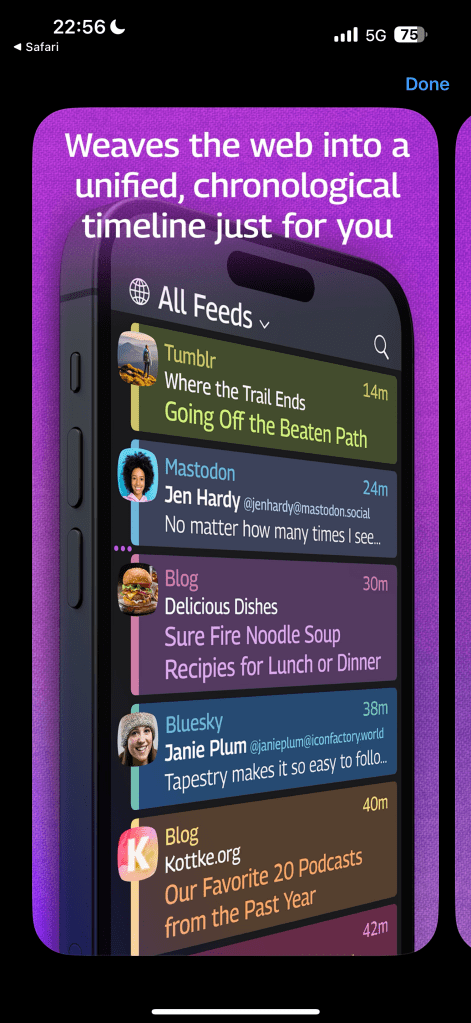 Tapestry och Reeder låter dig mata in vad du vill från en mängd olika källor. Det spelar ingen roll om det är bloggar, podcasts eller YouTube-konton, sociala nätverk som Bluesky eller Mastodon, Pixelfeed, Substacks, Reddit m.m. Det bara funkar och ger dig snabbt och enkelt koll på innehållet du följer. Så RSS är då inte dött, snarare mer levande än någonsin förut. Och just nu ger de här två apparna mig vad jag söker.