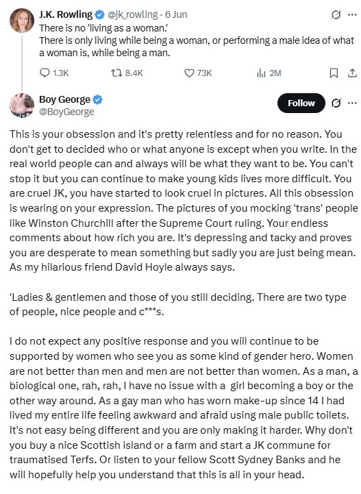 Avslutningsvis så har Boy George läxat upp den räliga transfobiska J.K. Rowling på Twitter. Det tycker vi är bra!