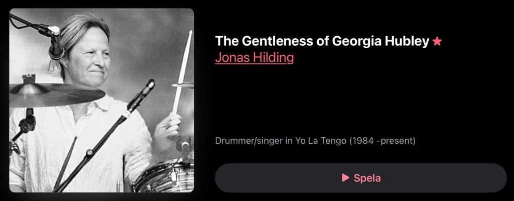 Georgia Hubley, den 65-åriga trummisen och sångerskan i sympatiska gamla indiebandet Yo La Tengo. De är still going strong sedan 40 år tillbaka – Georgia och äkta maken Ira Kaplan. Han förtjänstfullt på gitarr och sång, men det är bandets låtar där hustrun sjunger som alltid legat mig varmast om hjärtat. Nåt med mildheten i hennes röst. Hon låter ofta som en mer försynt Nico, ja som en blyg viol-variant och samtidigt mer mogen version av ikonen, skulle man kunna säga. Så Georgia förtjänar en egen spellista, och Yo La Tengo är ett förbaskat trevligt band som liksom följt med mig genom livet.