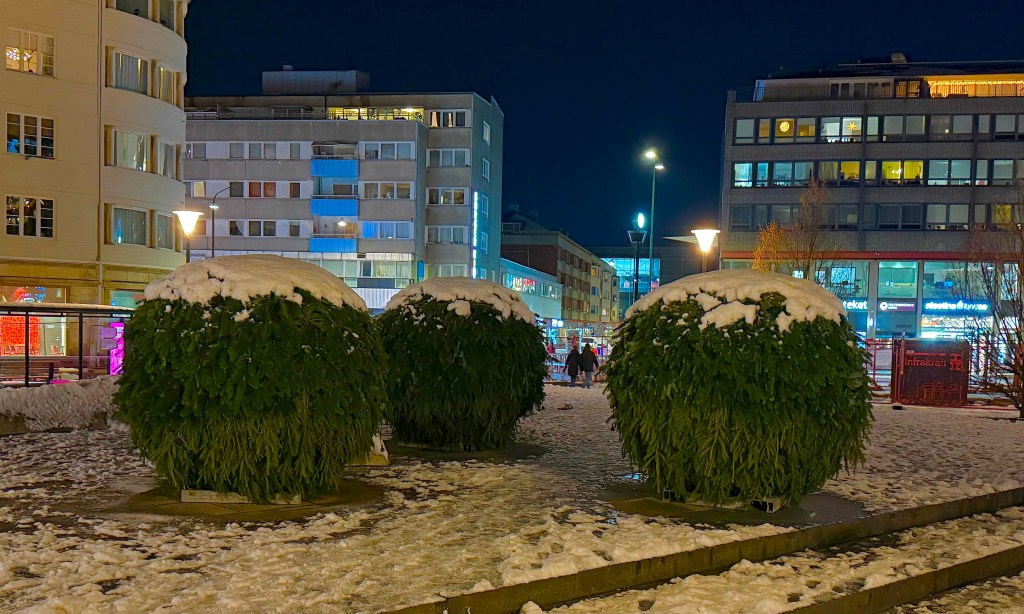 Så kom vintern till stan. Snövitt och vackert på Värnhemstorget, men ingen gran och inget dött Tjernobyl-julträd, tyvärr. Men de tre stora gran/grön-bumlingarna står på plats, som de gjort de senaste åren. Jag har vant mig och gillar dem nu. De ser lustiga ut, speciellt med snösprits on the top!